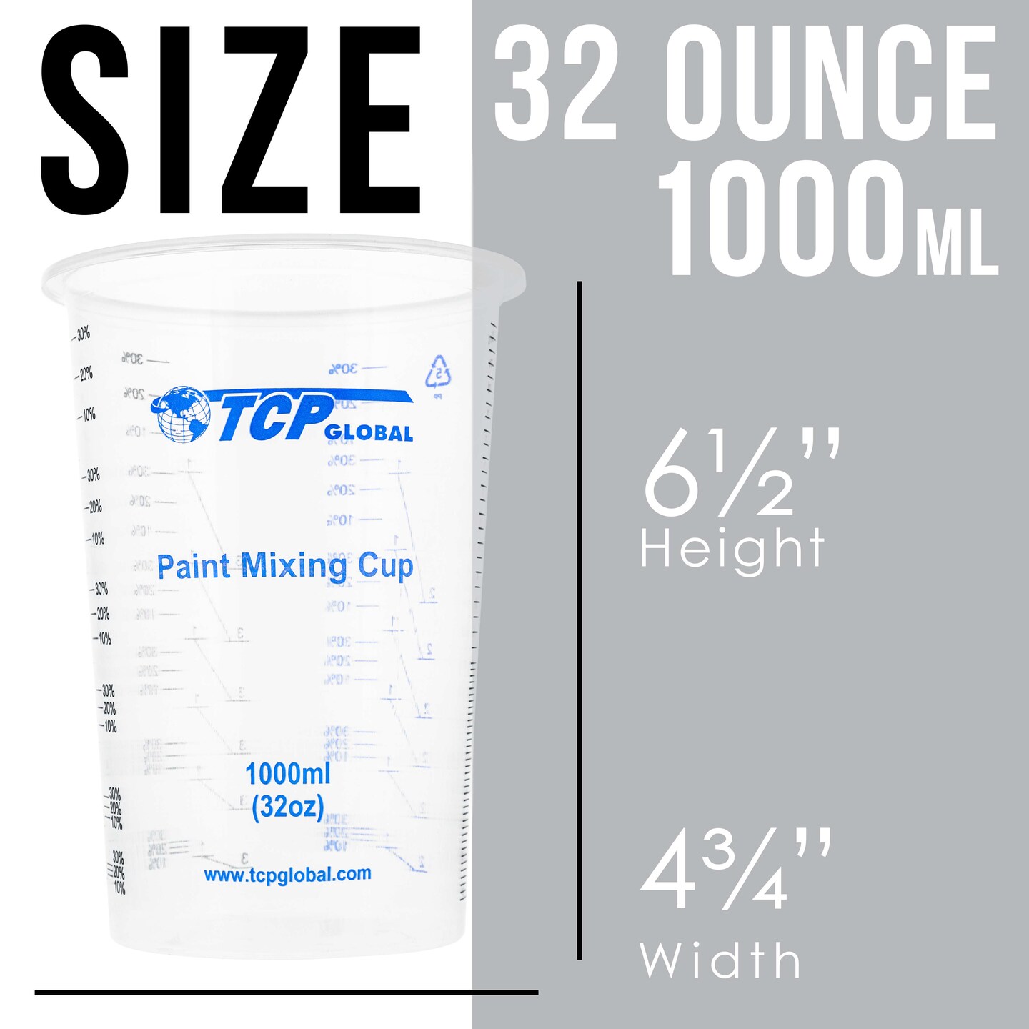 32 oz. (1000ml) Graduated Plastic Mixing Cups (Box of 25) - Disposable Plastic Measuring Cups for Liquids, Paints, Resin, Epoxy, Art, Kitchen - Ratios 2-1, 3-1, 4-1 ML