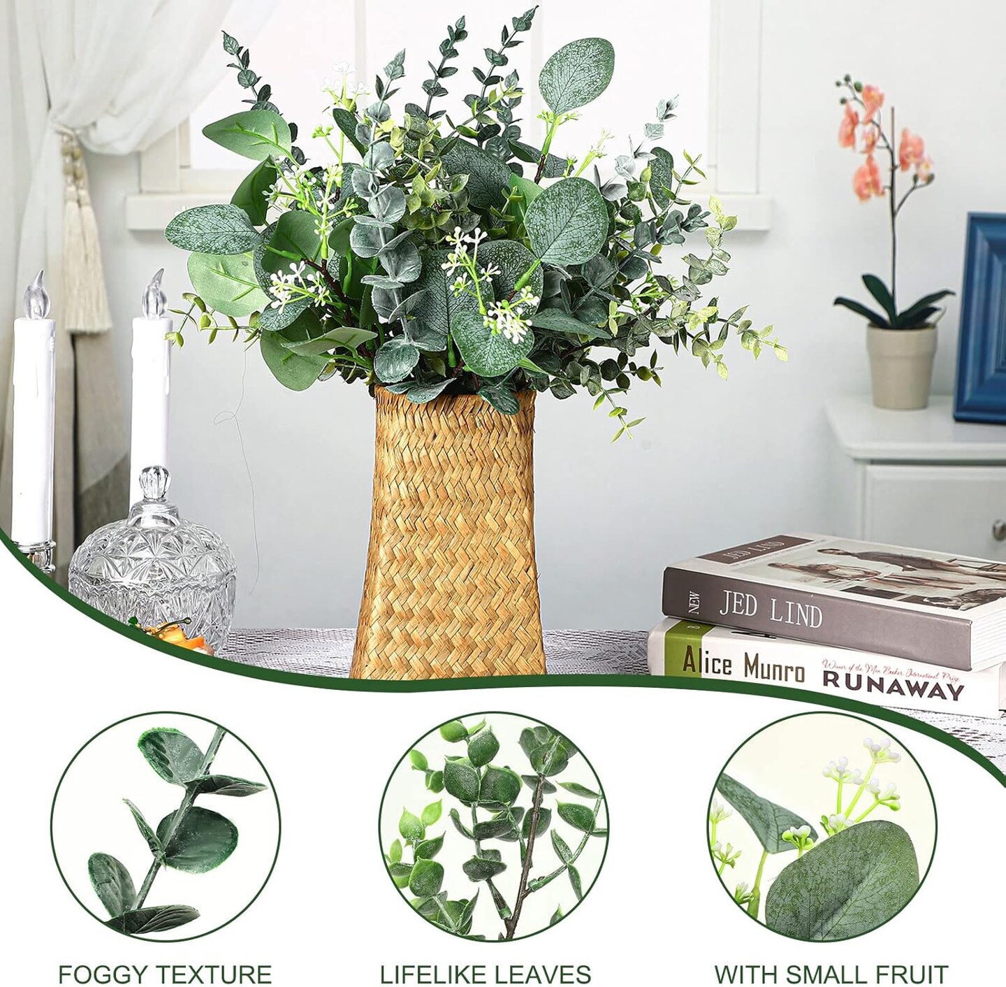 32 piece set of artificial eucalyptus stems with mixed greenery, featuring silver dollar style leaves, designed for rustic vases, floral arrangements, wreaths, bouquets, and wedding decorations in a classic style