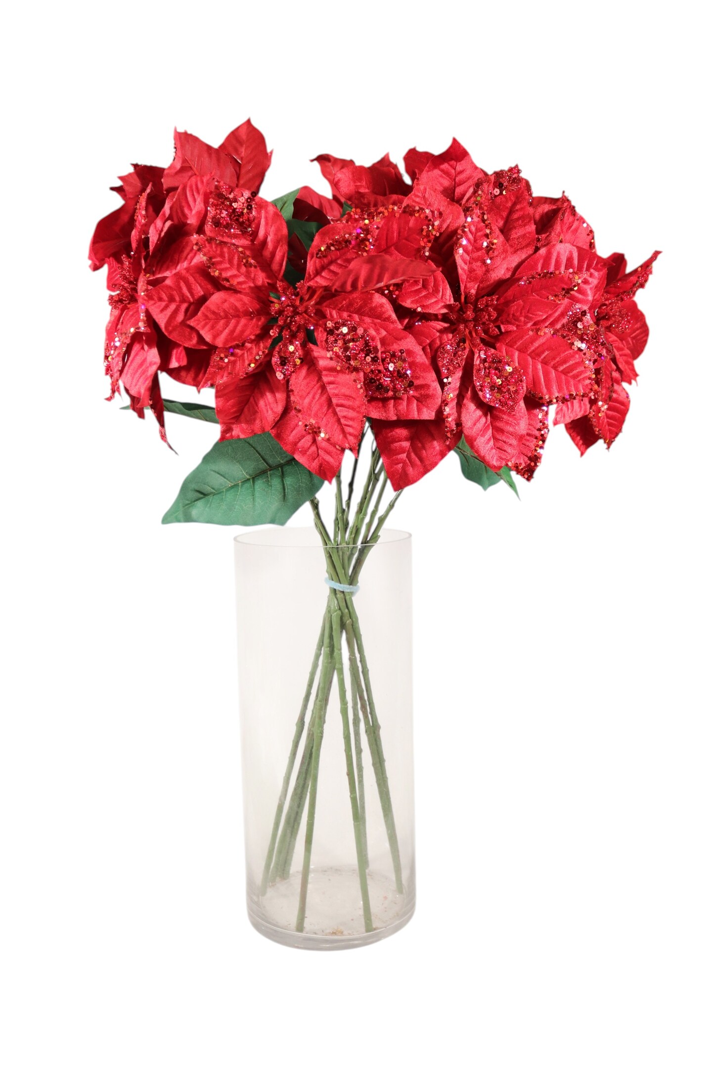 33" Red Poinsettia – Artificial Holiday Glitter Décor Flower, Christmas Faux Plant for Home, Wreaths & Centerpieces, Set of 3