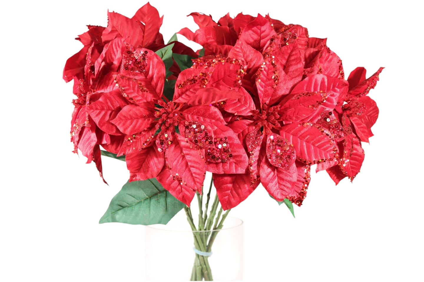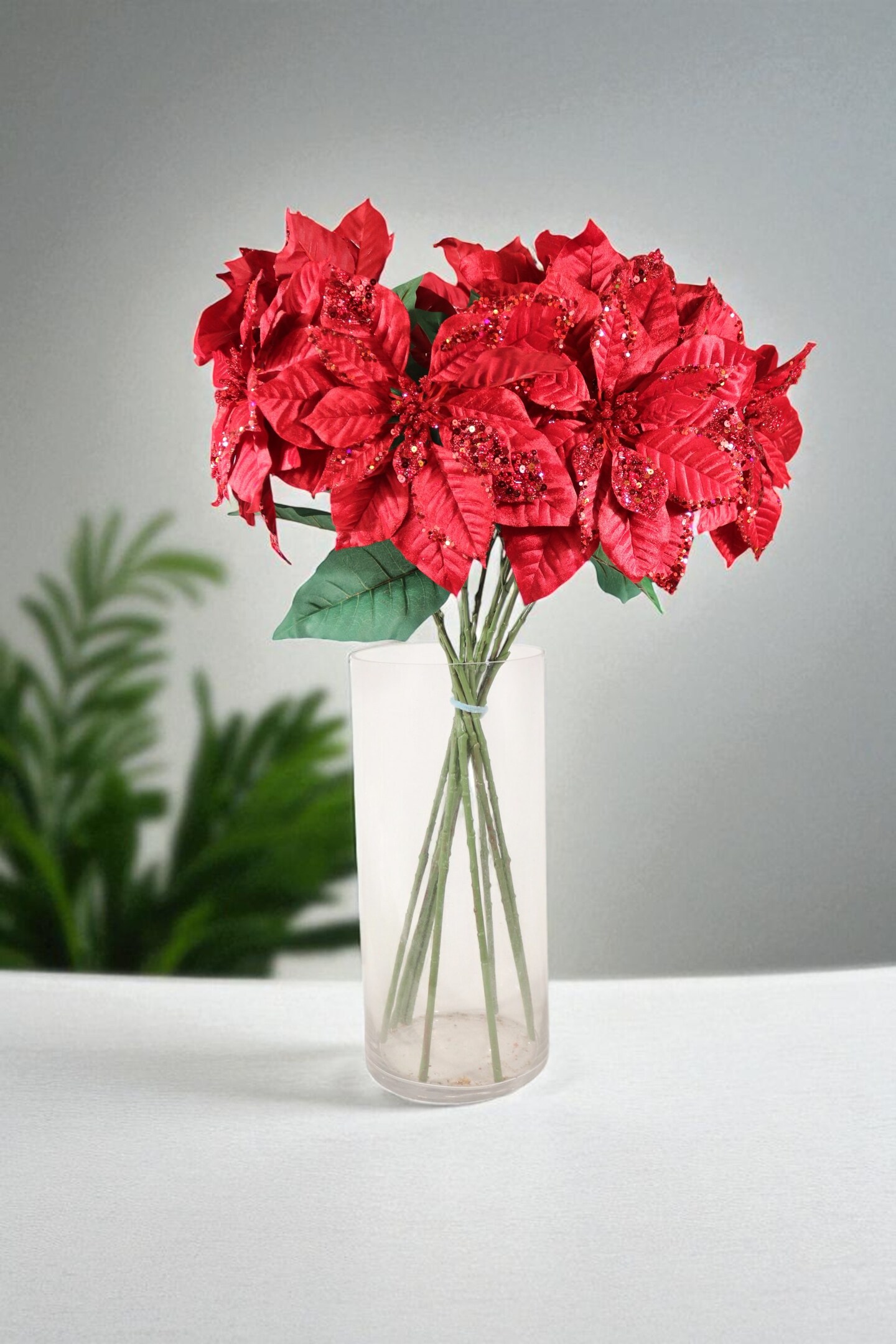 33" Red Poinsettia – Artificial Holiday Glitter Décor Flower, Christmas Faux Plant for Home, Wreaths & Centerpieces, Set of 6