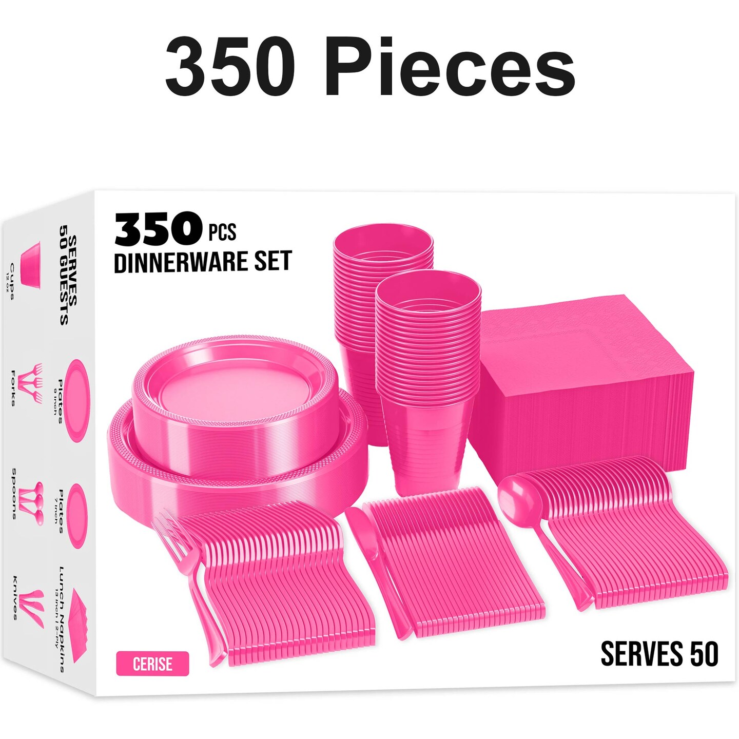 350 Count Hot Pink Plastic Plates and Utensils Combo Set for Wedding, Birthday, and Baby Showers