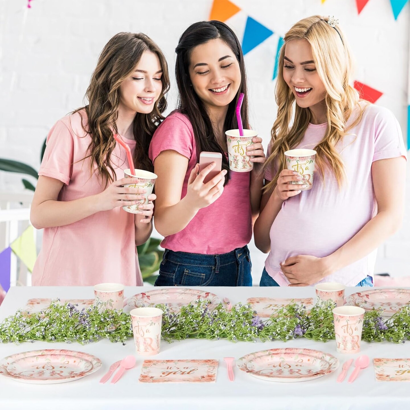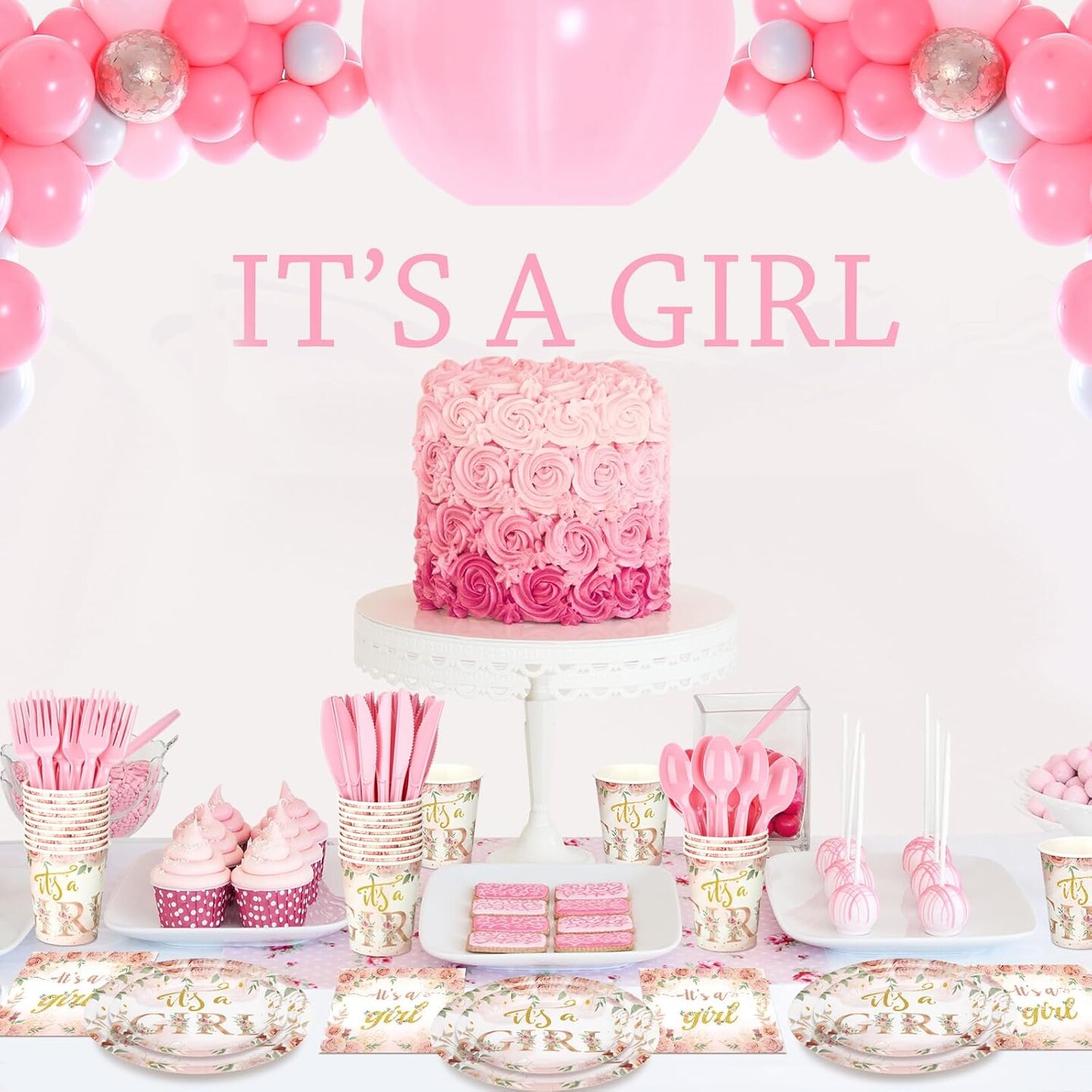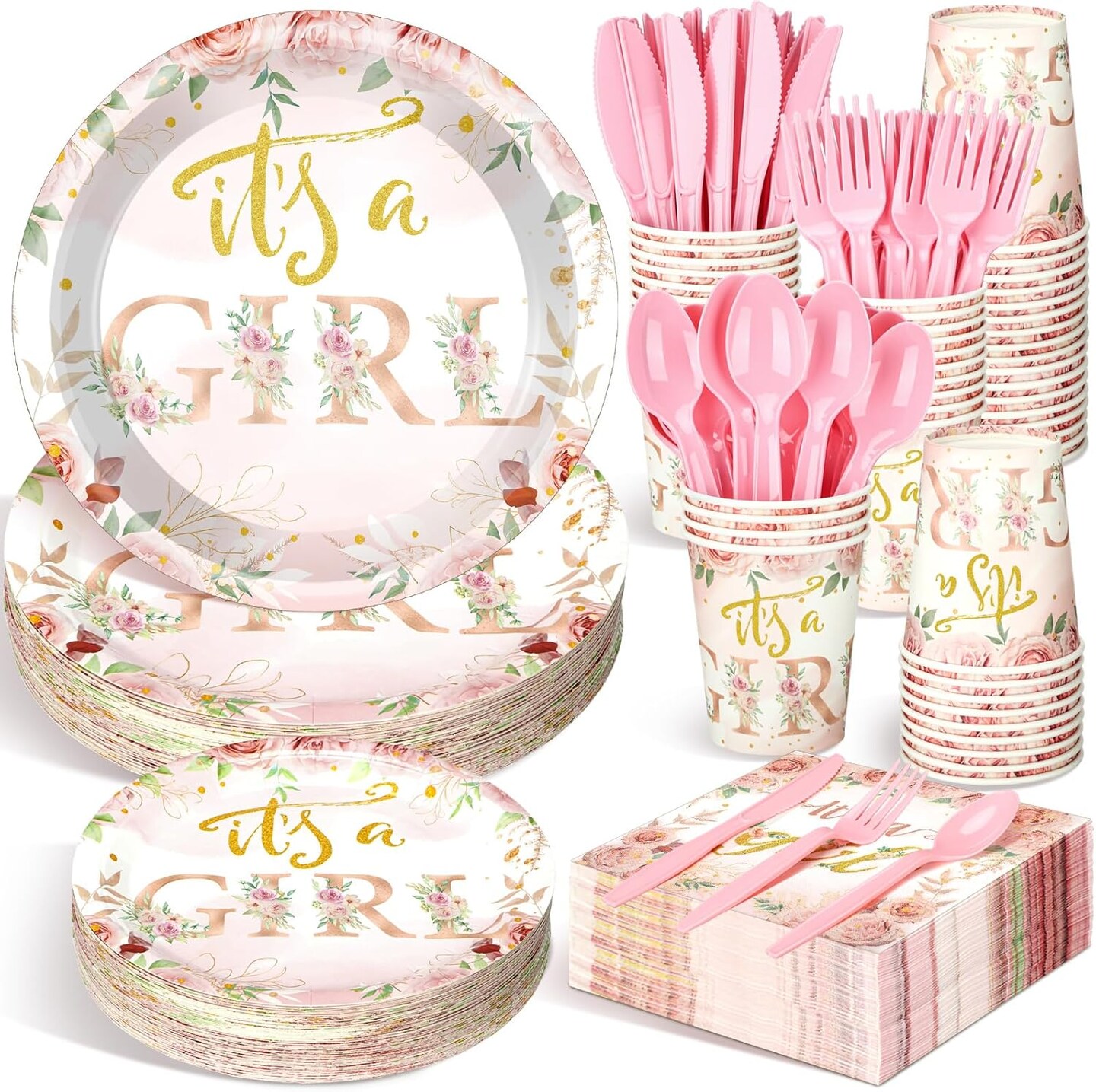 350 Pcs Baby Shower Plates Set - (Floral,Pink)