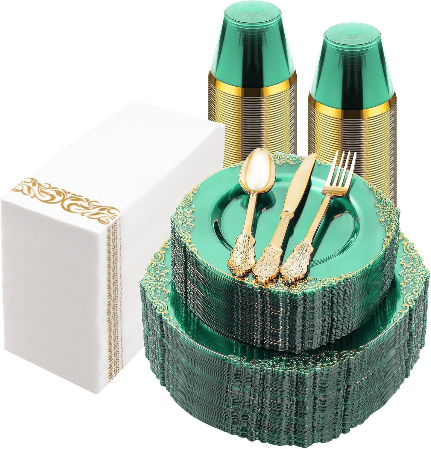 350PCS Green & Gold Disposable Dinnerware Set – Plates, Cutlery, Cups & Napkins for 50 Guests