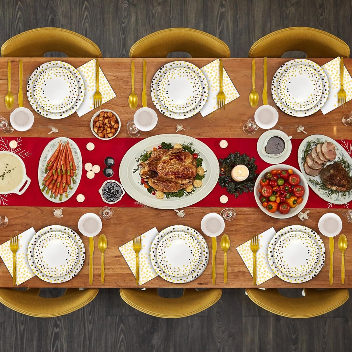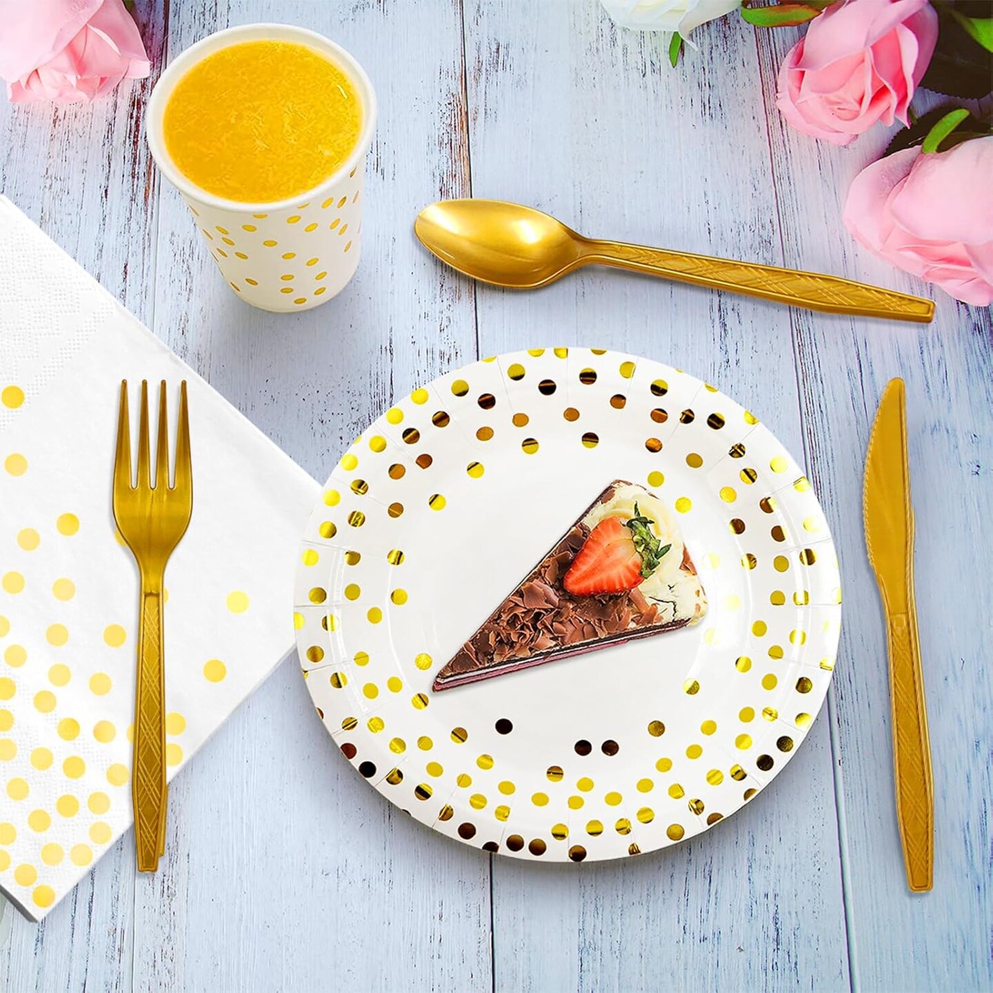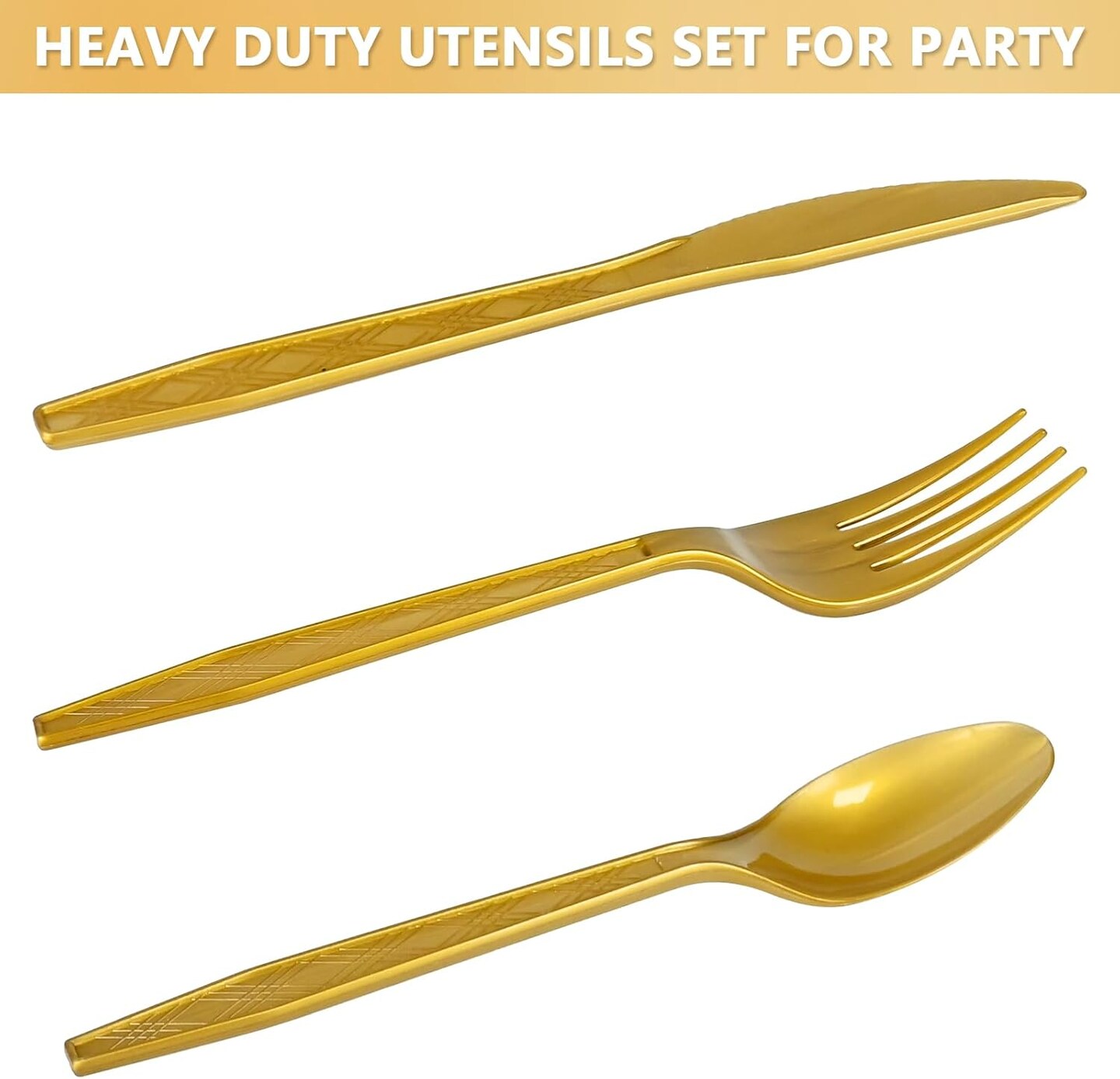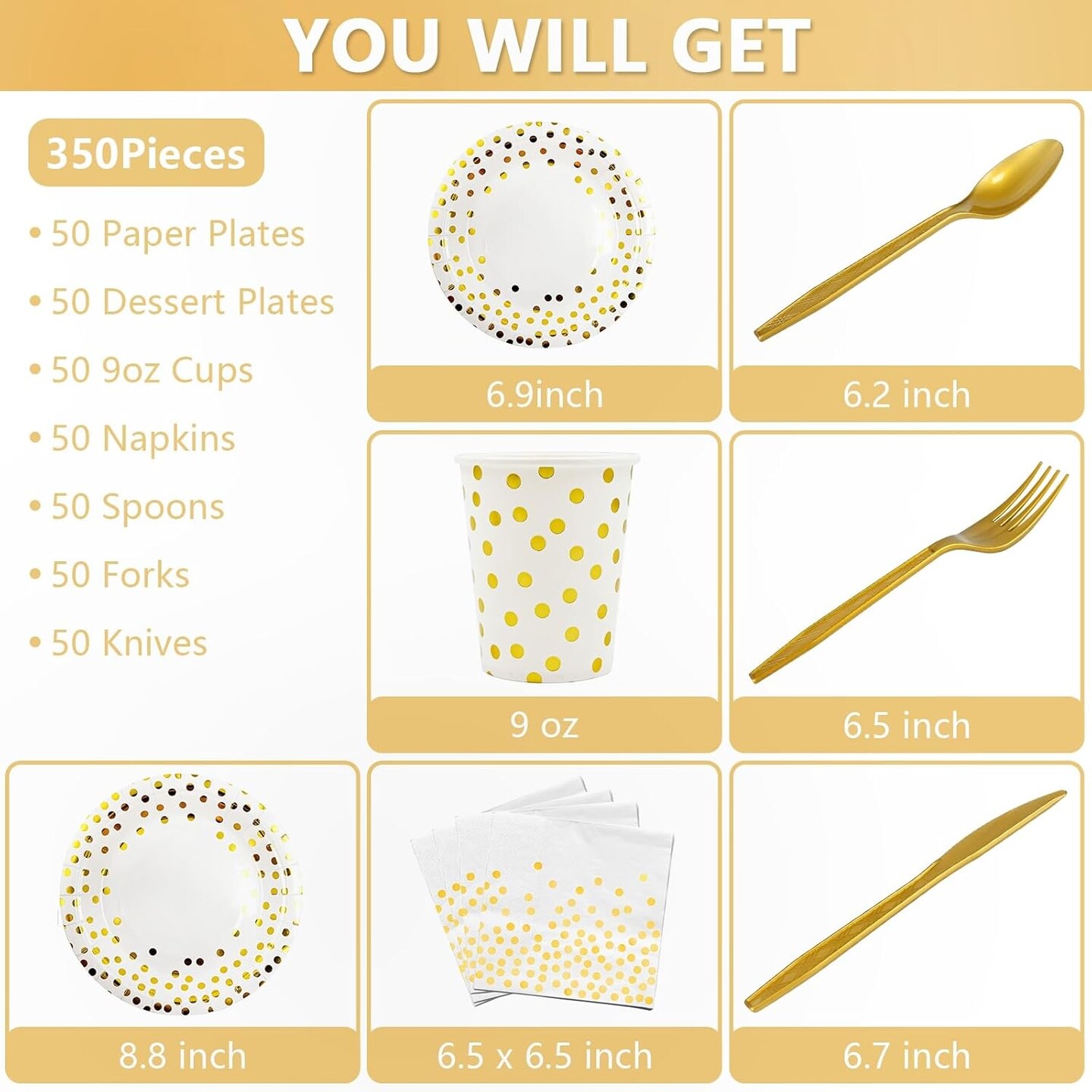 350-piece gold party supplies set, designed for 50 guests. Includes 50 dinner plates, 50 dessert plates, 50 silverware sets, 50 9oz cups, and 50 napkins. Perfect for weddings, parties, and events, featuring heavy-duty utensils for a stylish and conve