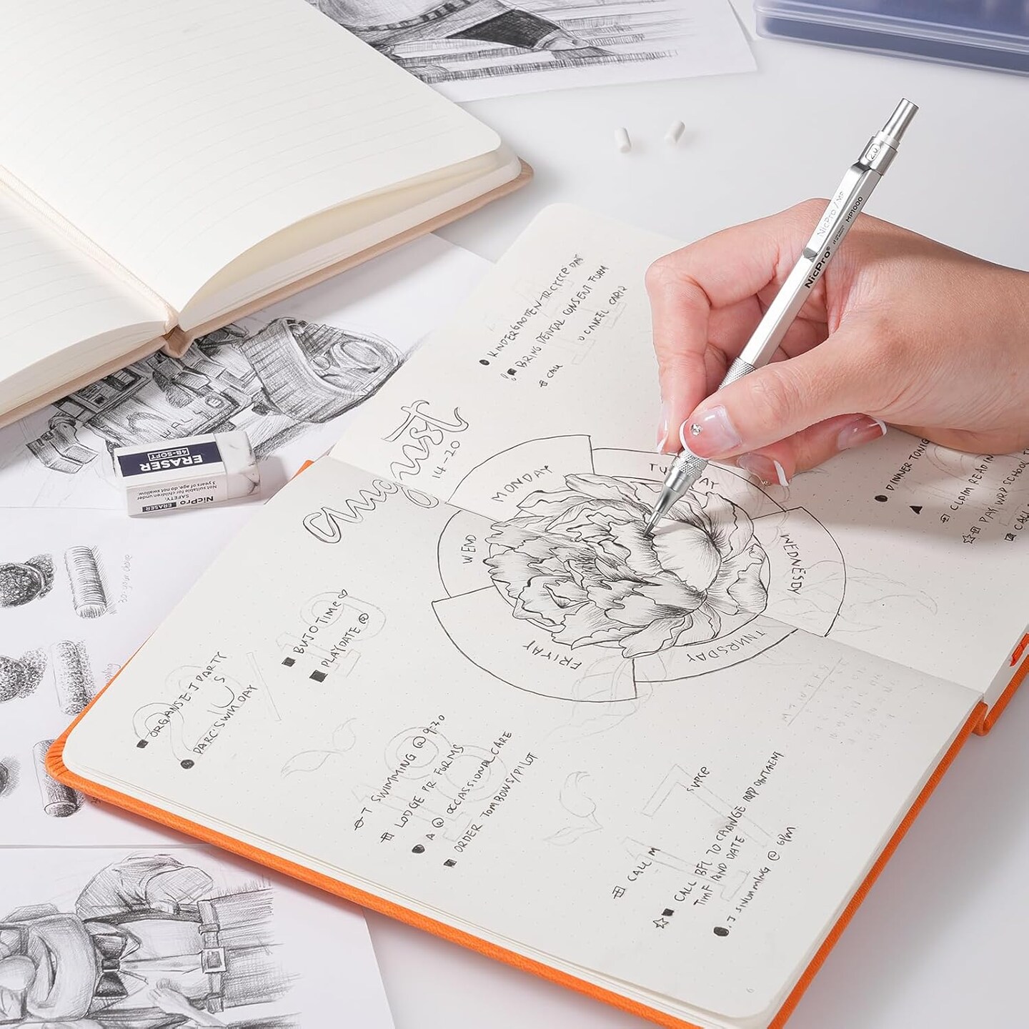 35-Piece Silver Metal Mechanical Pencil Set – 0.5/0.7/0.9mm & 3×2mm Graphite Lead Holders with 20 Tubes of Refills (6B–4H), Kneaded Erasers & Case – Ideal for Drawing, Sketching, and Drafting (Silver)