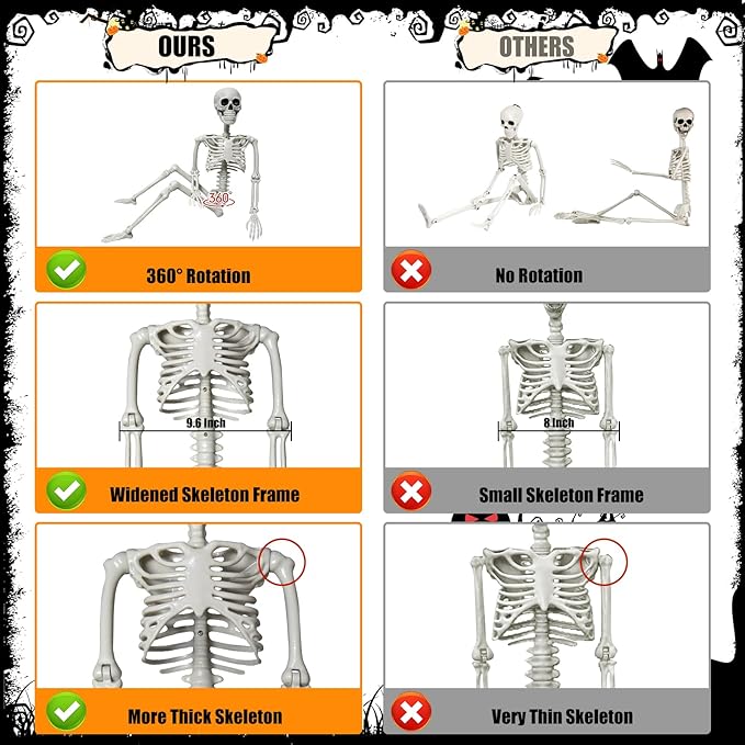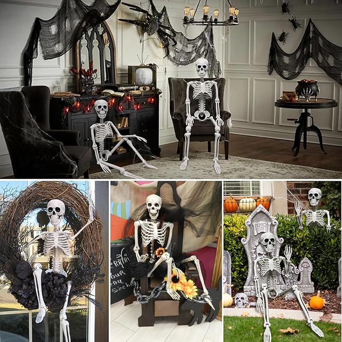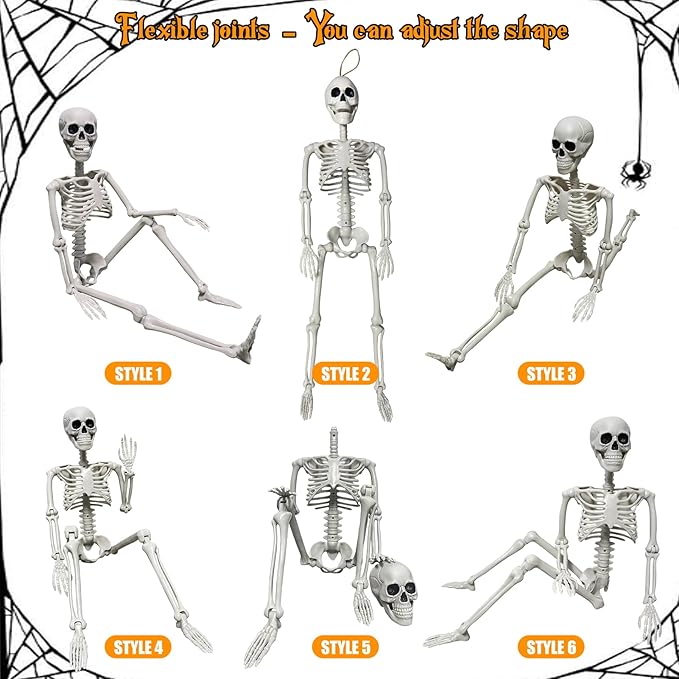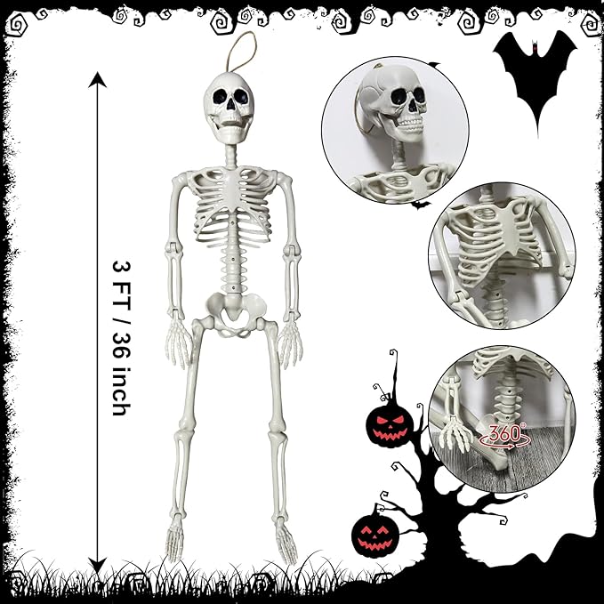 36'' Full Body Posable Skeleton Halloween Decor with Movable Joints, Plastic Skeleton Decor for Haunted House Graveyard Props Yard Outdoor Indoor