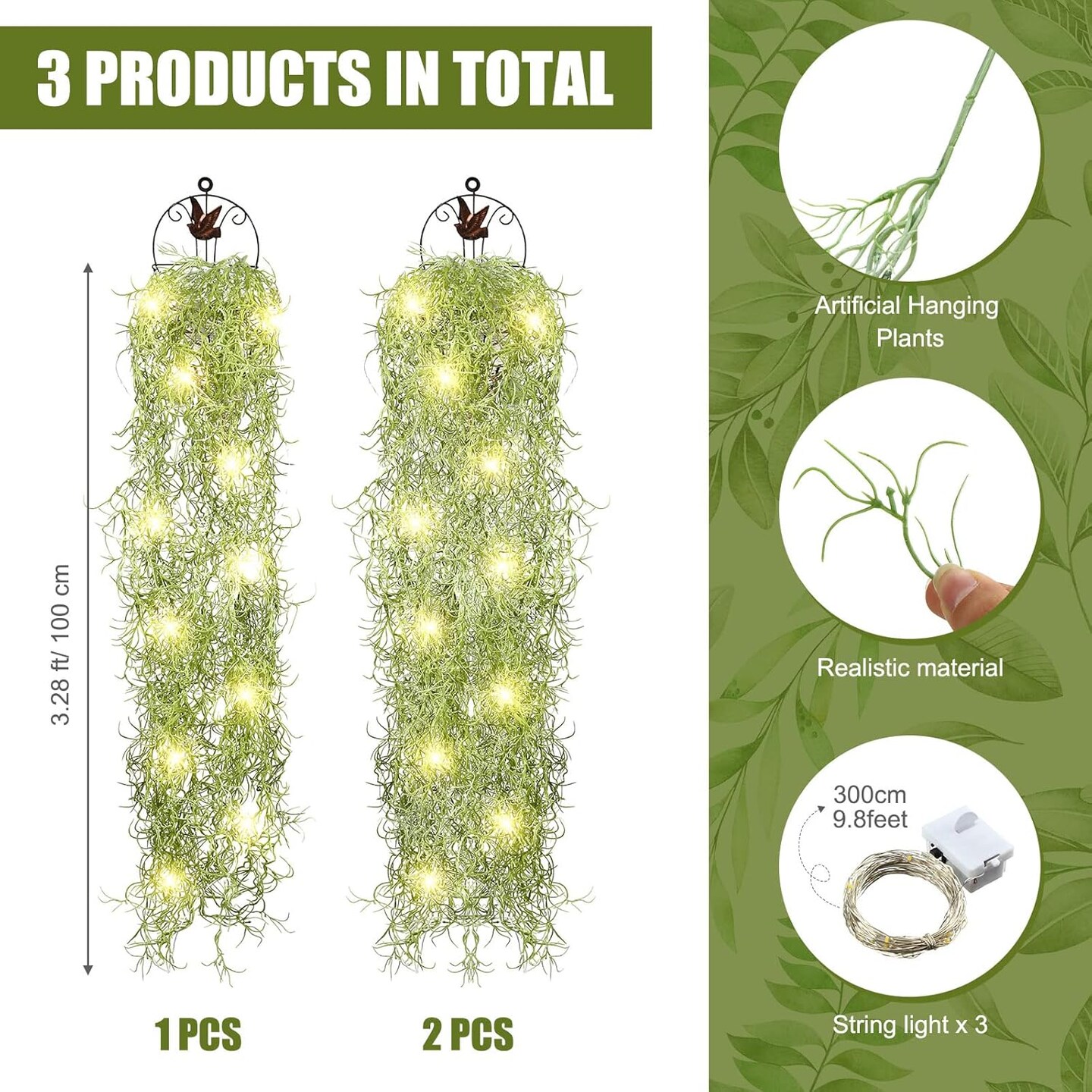 3.6 ft - 3 Packs LED Artificial Hanging Plants, Fake Hanging Plant Garland (Vines Moss)