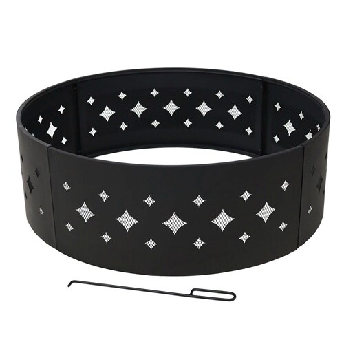 36 Inch Black Steel Fire Pit Ring with Diamond Cutouts Heavy Duty 4 Piece Assembly and Firewood Poker for Patio Backyard Campsite