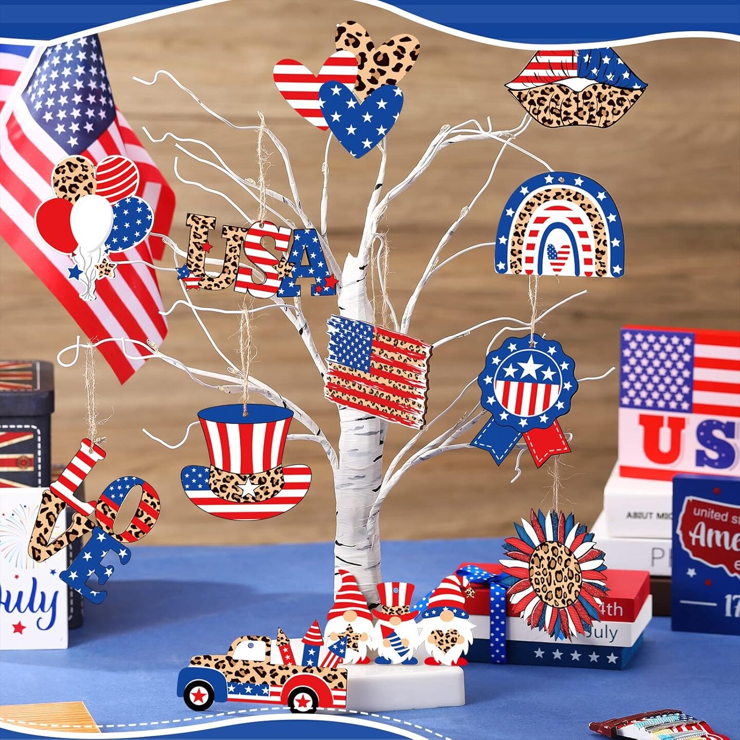 36 Pcs Patriotic Hanging Ornaments for Tree 4th of July Wood Decor Labor Day Independence Wooden Ornaments with Ropes Star USA Flag Gnome Red White and Blue Decorations Memorial Day(Leopard)