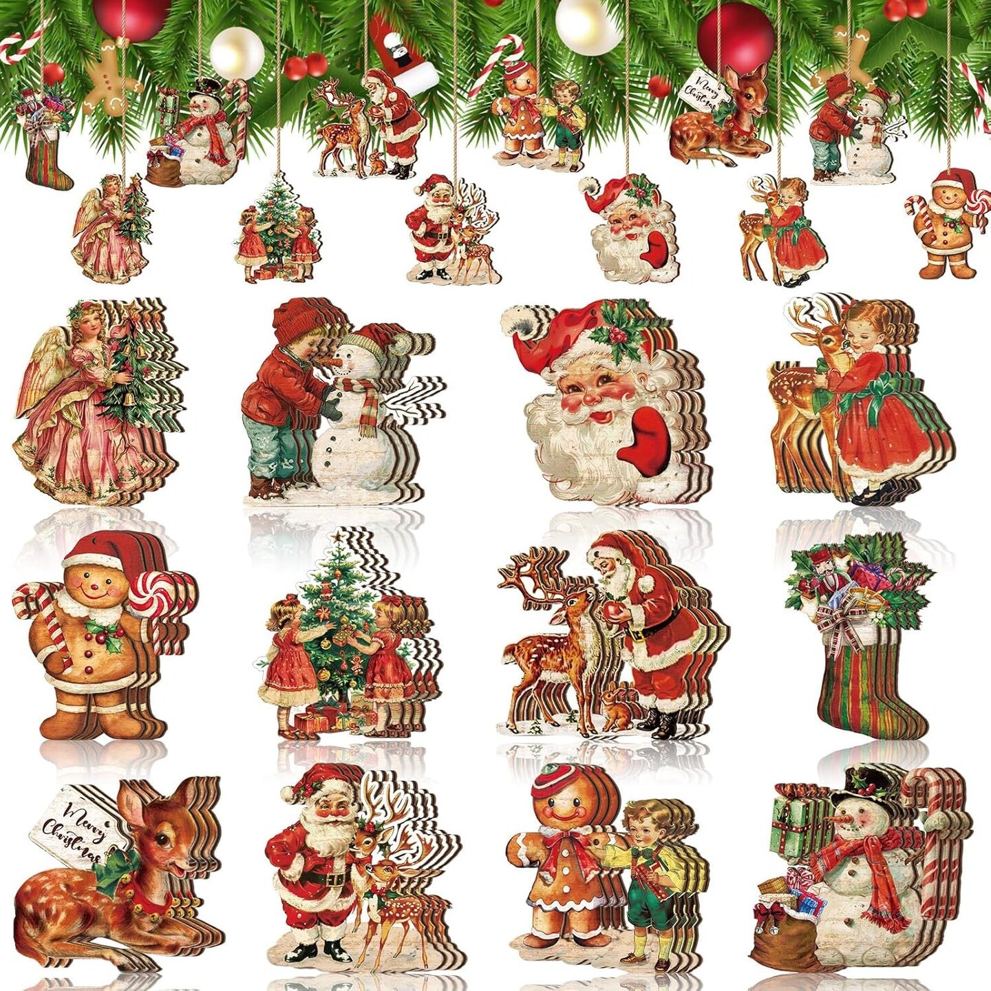 36 Pcs Vintage Christmas Ornaments Wooden Christmas Tree Ornaments Snowman Snowflake Santa Wood Cutouts Rustic Farmhouse Christmas Tree Decorations for Home Xmas Winter Party(Retro)