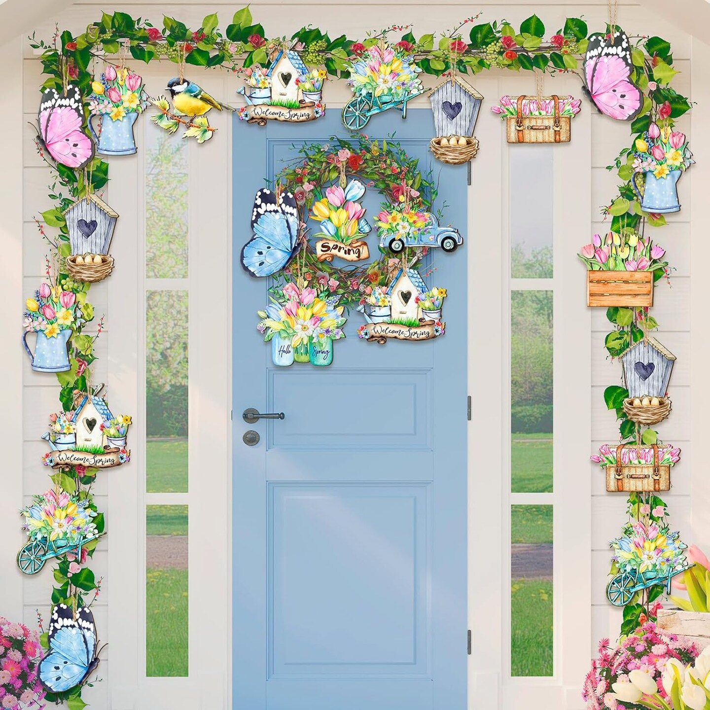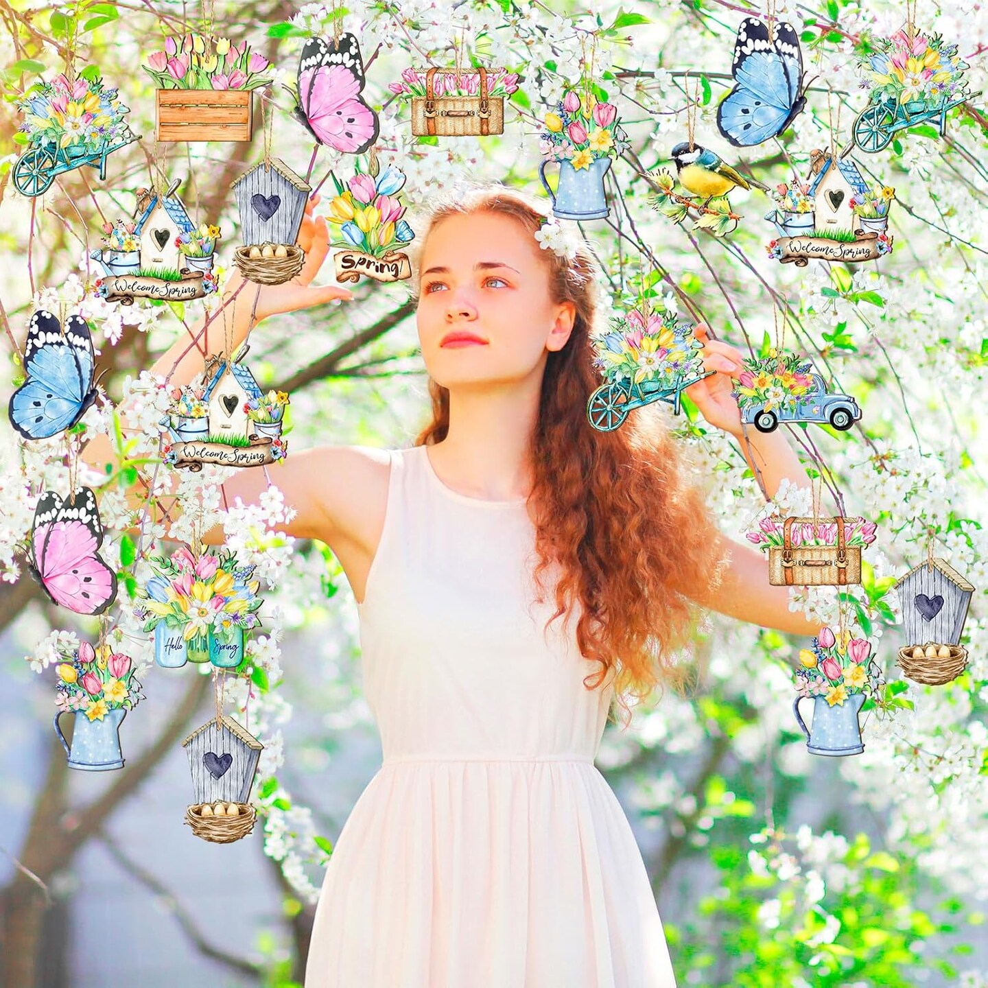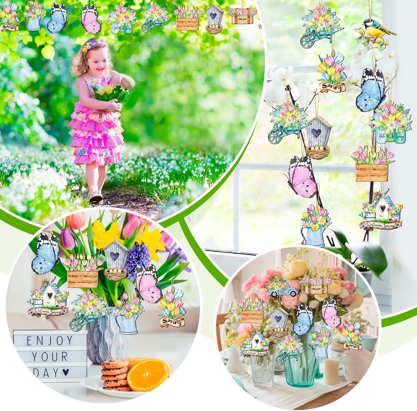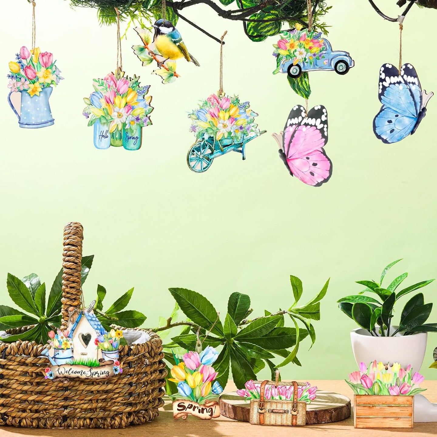 36 Pcs Vintage Spring Ornaments for Tree Decorations Wooden Hanging Tulip Floral Ornaments Spring Hawaii Decorations