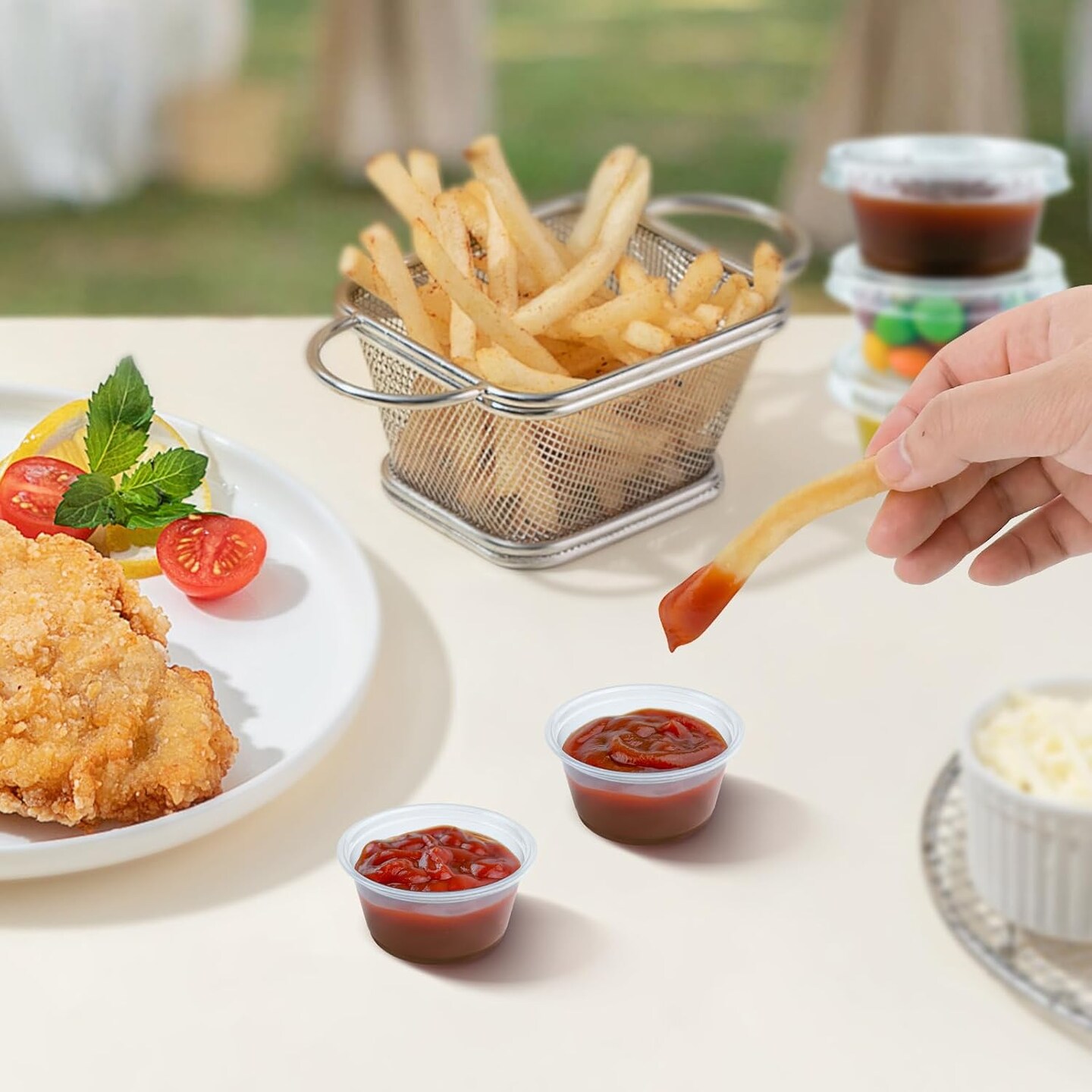 360 Set 2 oz Shot Cups with Lids, Sturdy & Food Safe Disposable Plastic Portion Condiment Dipping Sauce Cups, Small Containers for Salad Dressing