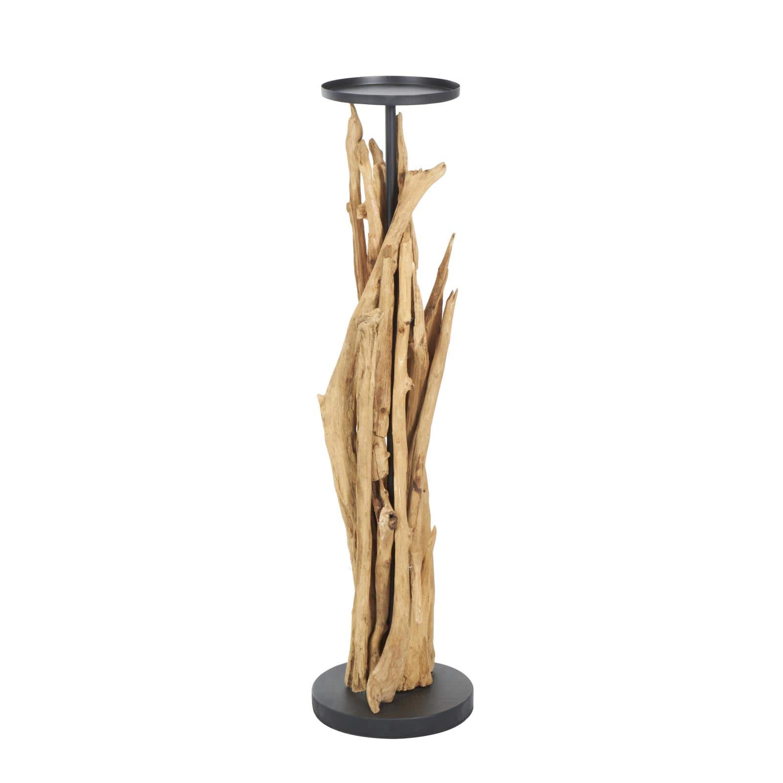 39" Brown Teak Wood Handmade Tall Tree Branch Floor Candle Holder with Black Metal Accents