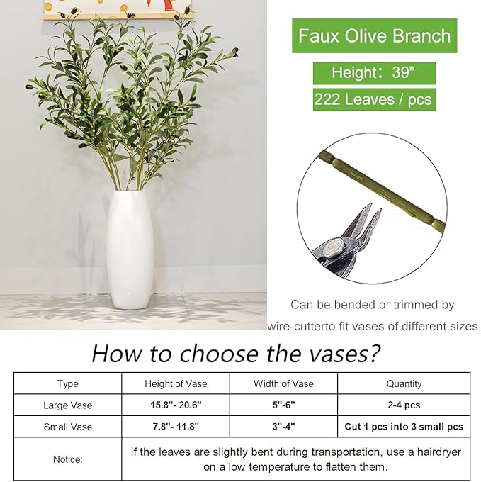 39 Inch Artificial Olive Branch Greenery Stems Fake Plants with 222 Leaves for Vase Faux Olive Branches Home Decor Indoor 2PCS