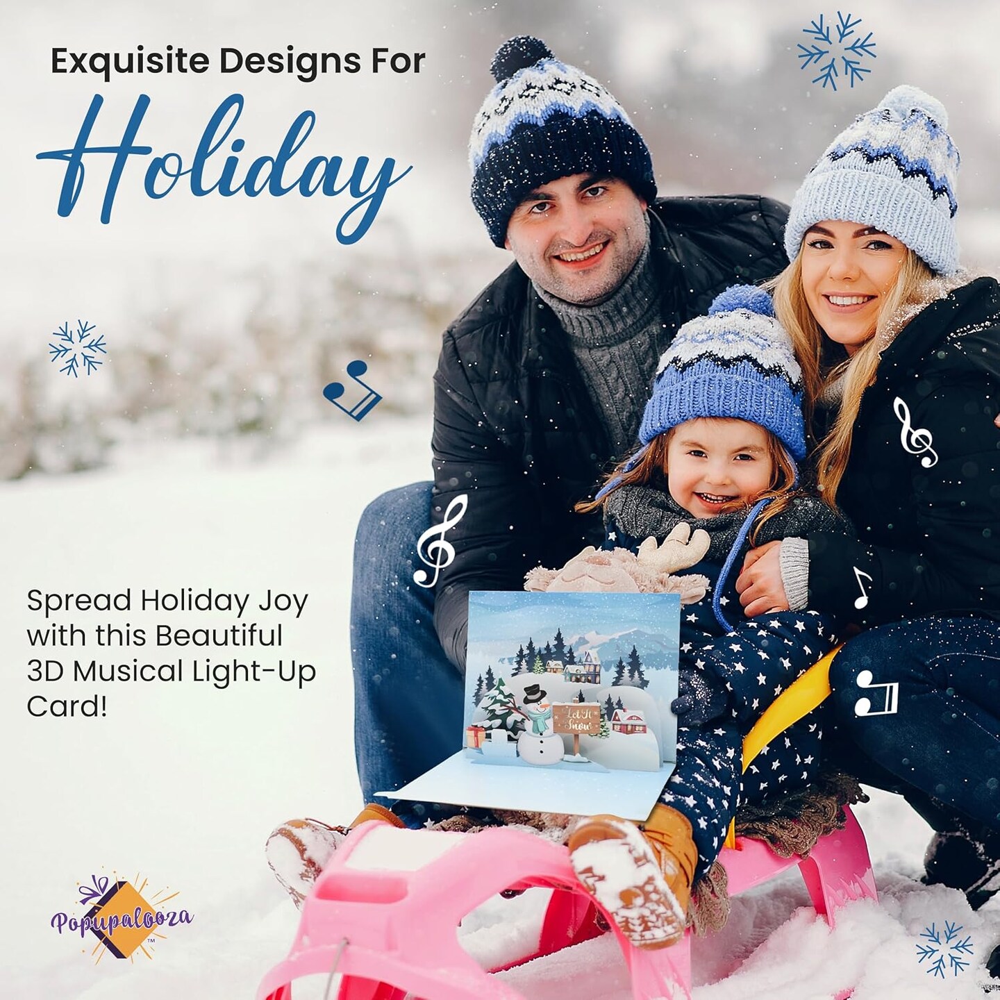 3D Popup Christmas Holiday Greeting Card with Music and Lights, Snowman Let It Snow Scene Design, Handmade - Includes Blank Note Card, Mailing Envelope - Plays Holiday Music