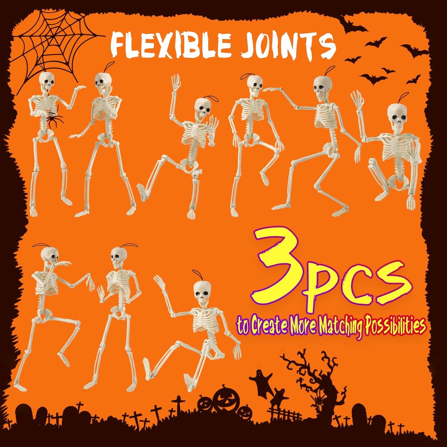 3Pack 16” Halloween Skeleton, Posable Skeleton Plastic Mini Skeleton Decor with Movable Joints, Outdoor Halloween Decor Props for Halloween Party Yard Haunted Houses Porch
