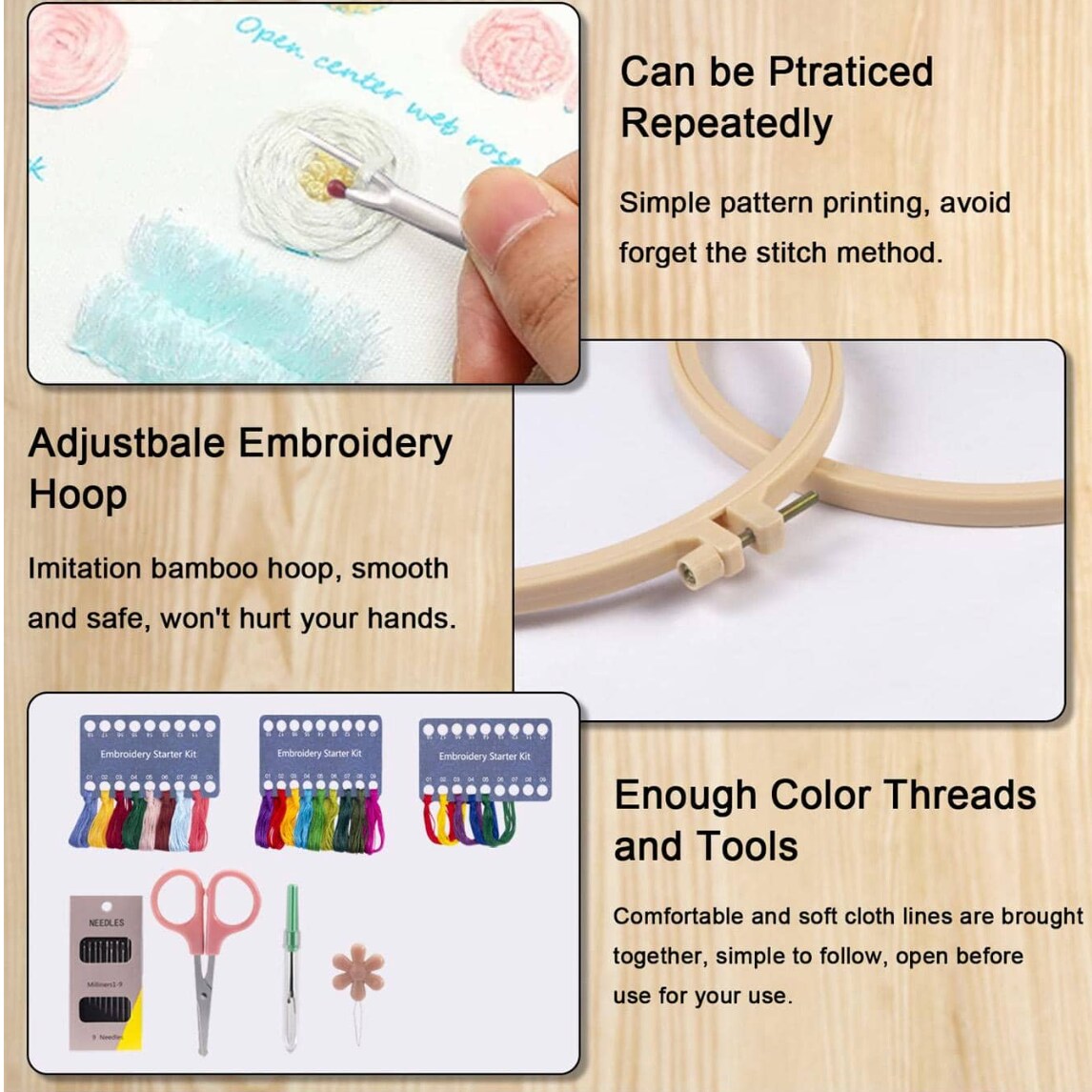 3-Pack Beginner Embroidery Kit – Learn 33 Stitch Techniques with Floral Patterns, Hoops, Threads & Tools