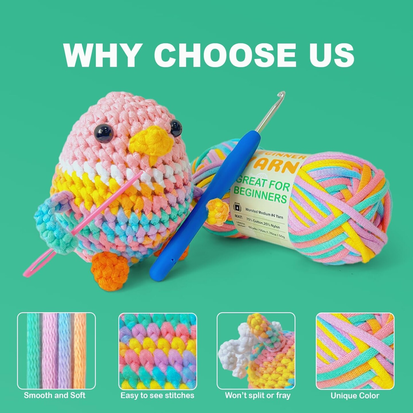 3-Pack Cotton-Nylon Beginner Yarn for Crocheting & Knitting – Worsted Medium #4, 3 × 50g / 1.76oz, 60yds Each – Easy-to-See Stitches, Amigurumi-Friendly Crochet Kit (Petal, Blue, Merry Pink)