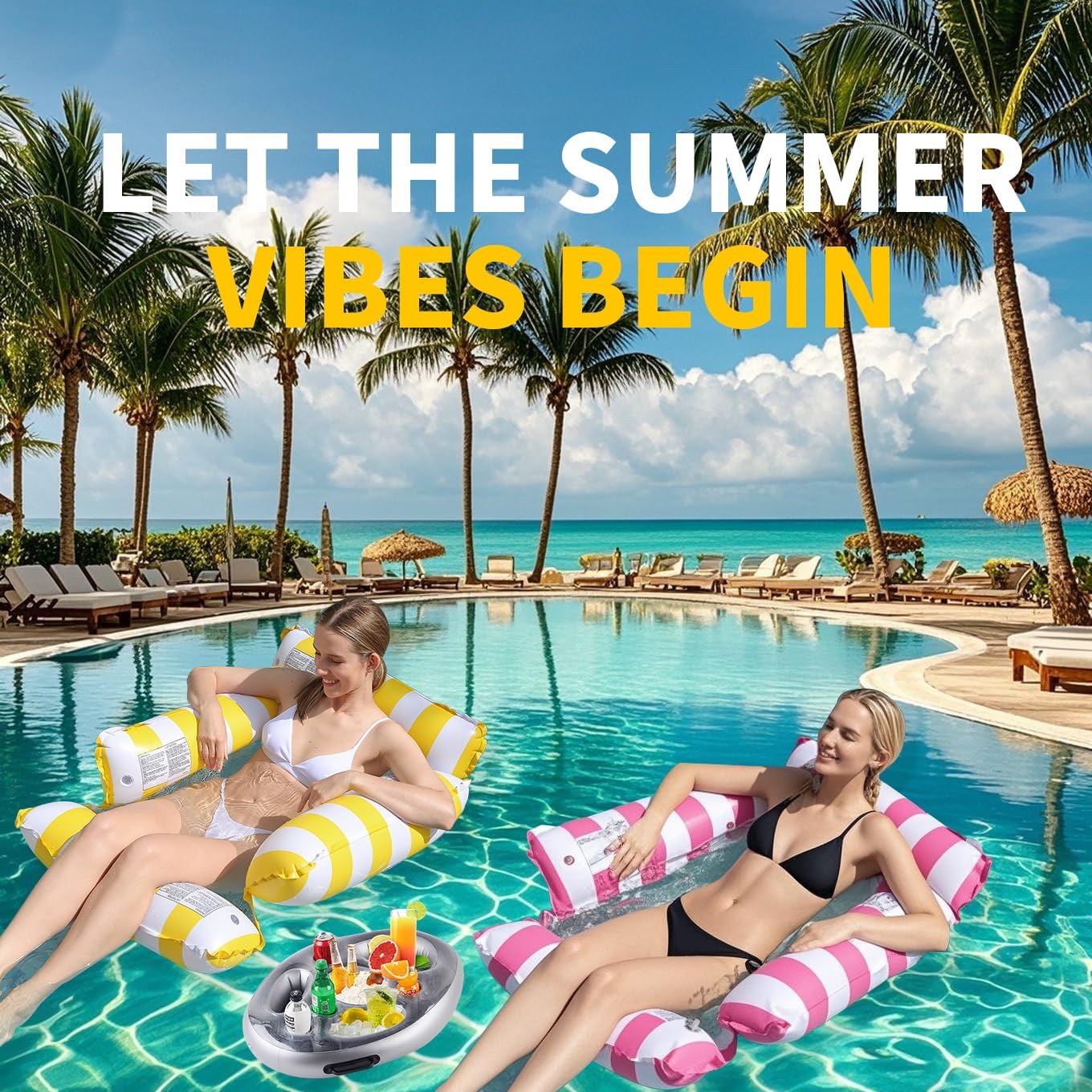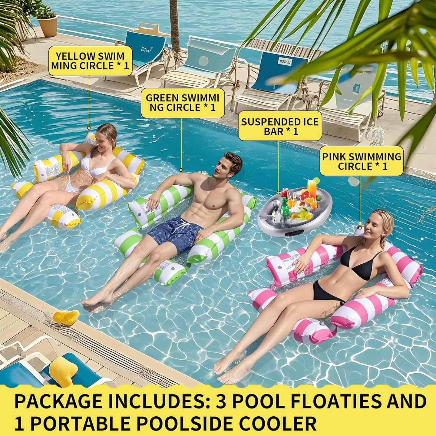 3-Pack Inflatable Swim Ring for Kids & Adults+ 1 Pool Ice Bar - Durable Pool Float, Fun Beach Toy, Easy to Inflate, Bright Colors, Perfect for Pool, Lake, or Summer Parties