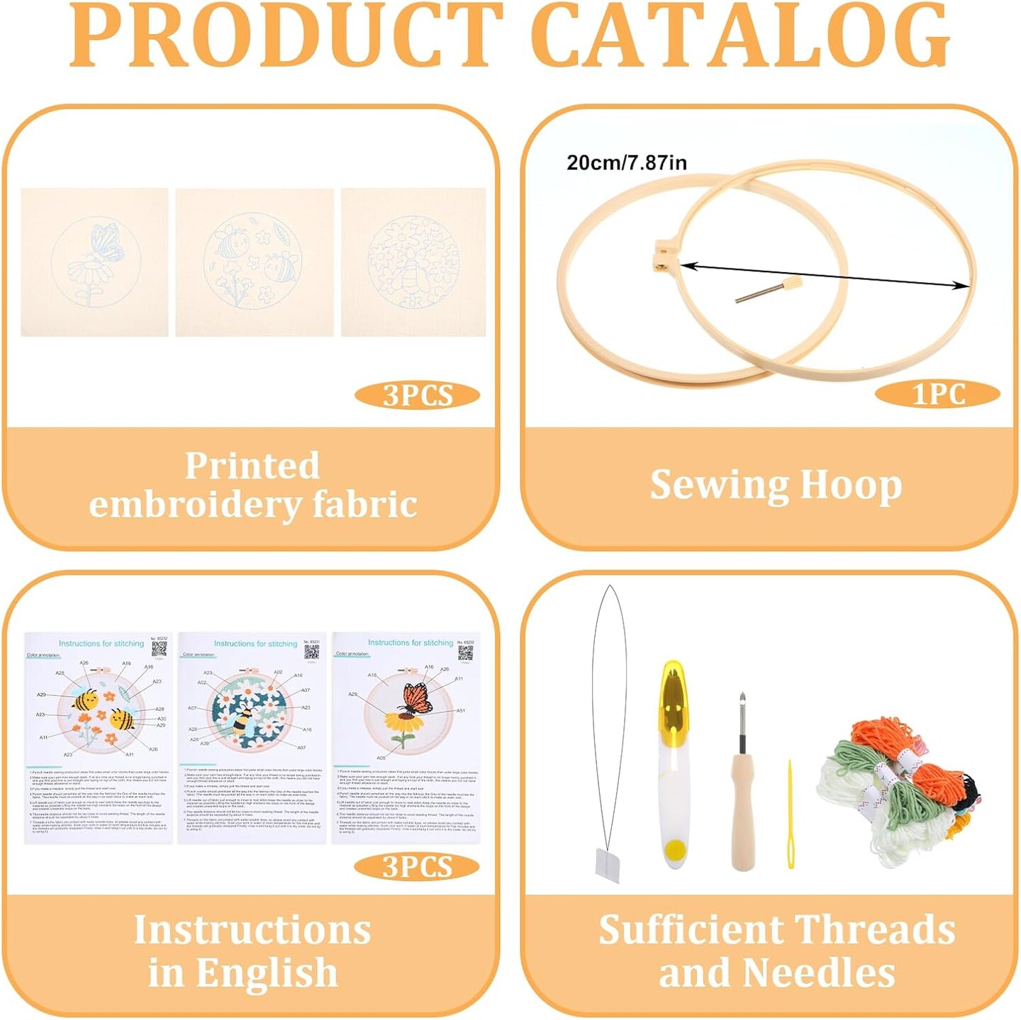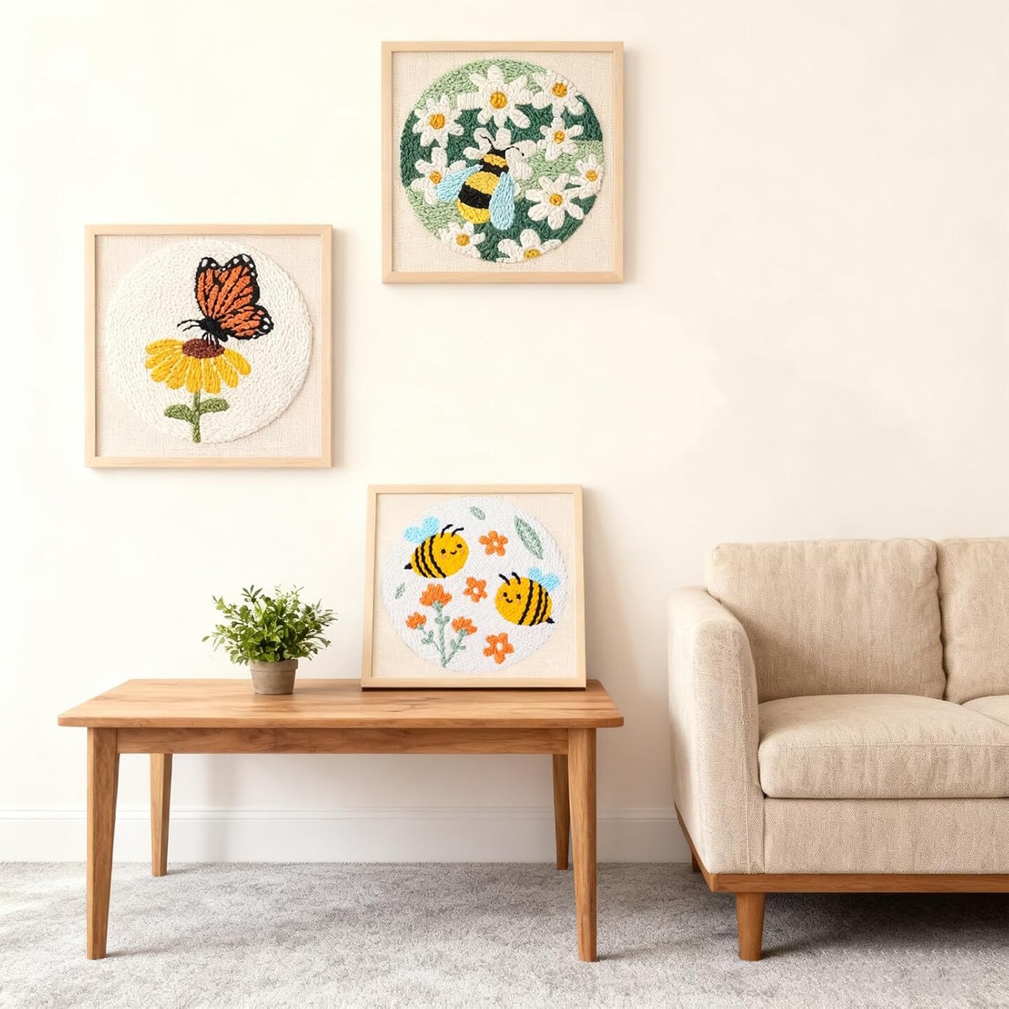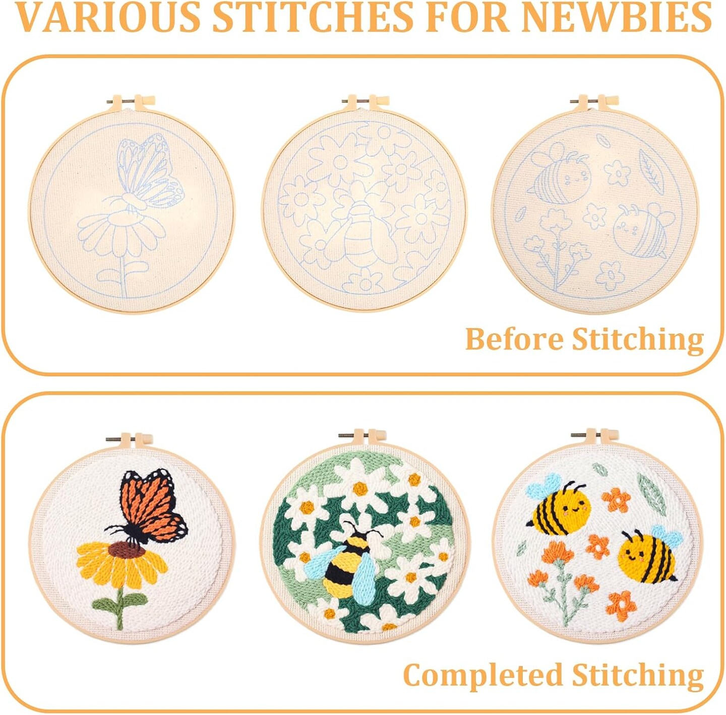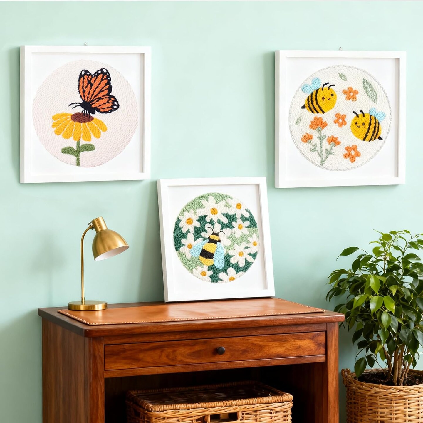 3-Pack Punch Needle Kit – Cute Floral, Bees & Butterfly Embroidery Set for Beginners and Kids, Includes Hoop, Needles, Yarn, Fabric & Instructions