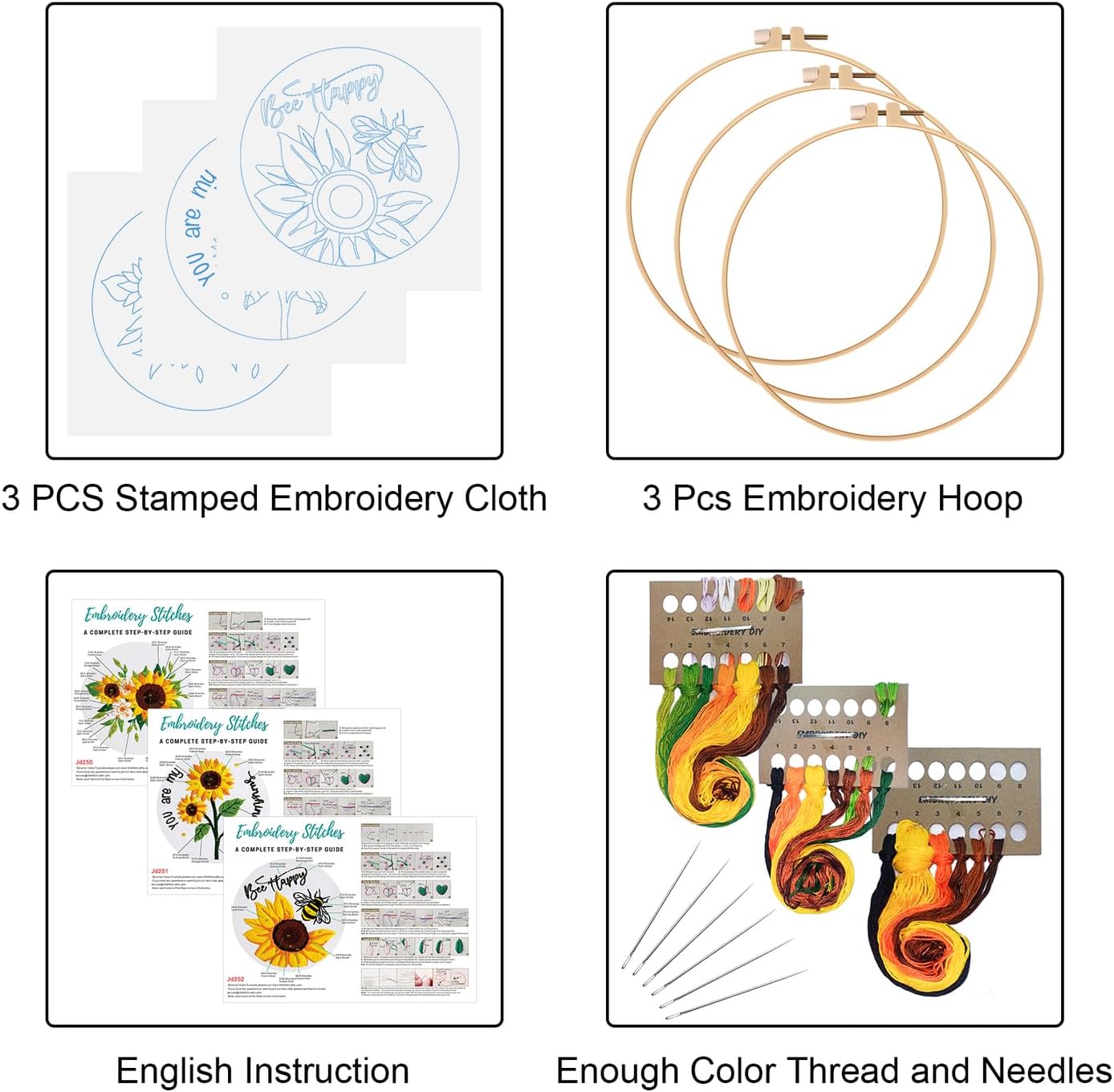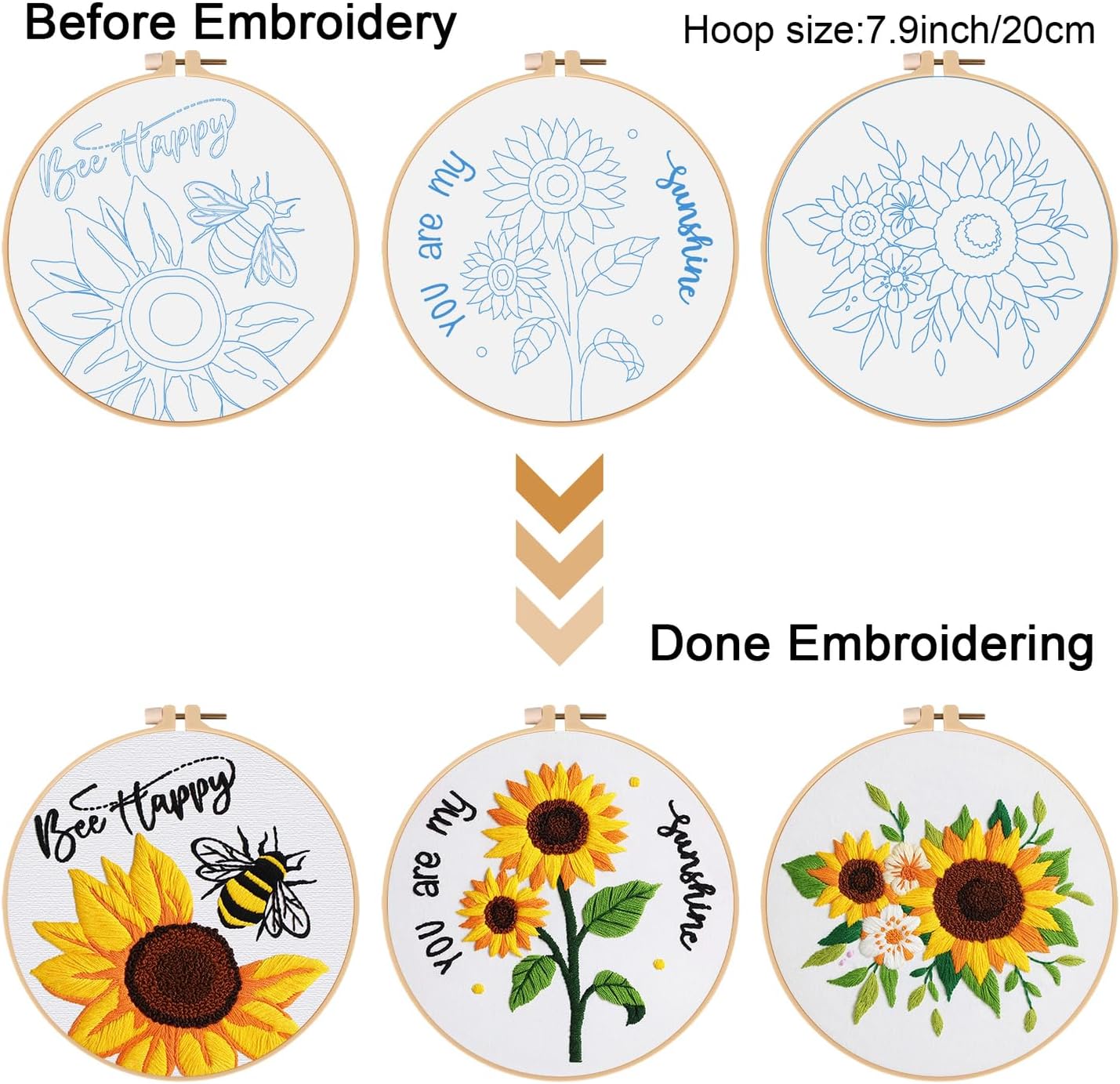 3-Pack Sunflower Embroidery Kit for Beginners – Cross Stitch Set with Bee & Summer Flower Patterns, Hoops, Needles & Instructions for Adults DIY Needlepoint