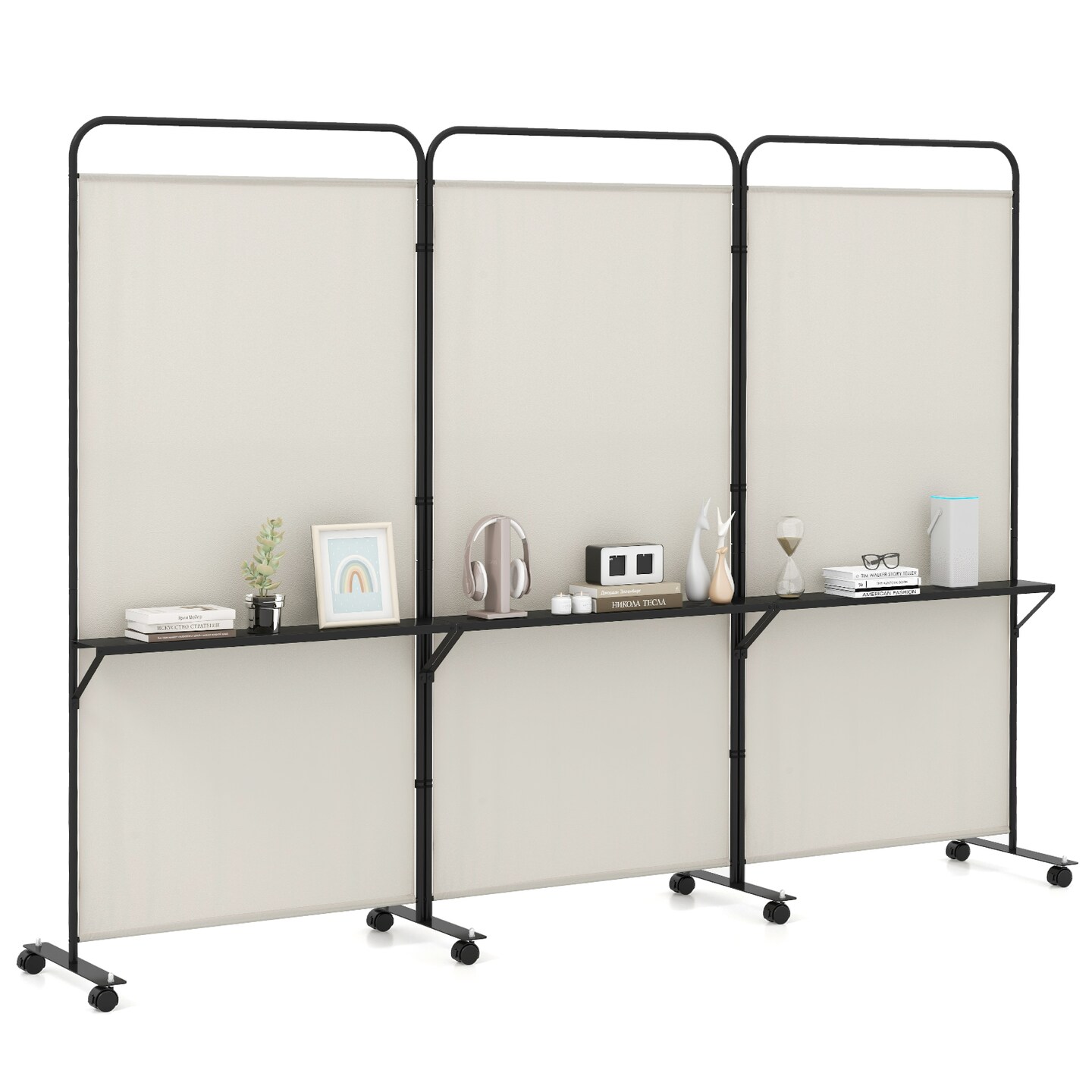3-Panel Folding Room Divider with 3 Metal Shelves and Lockable Wheels