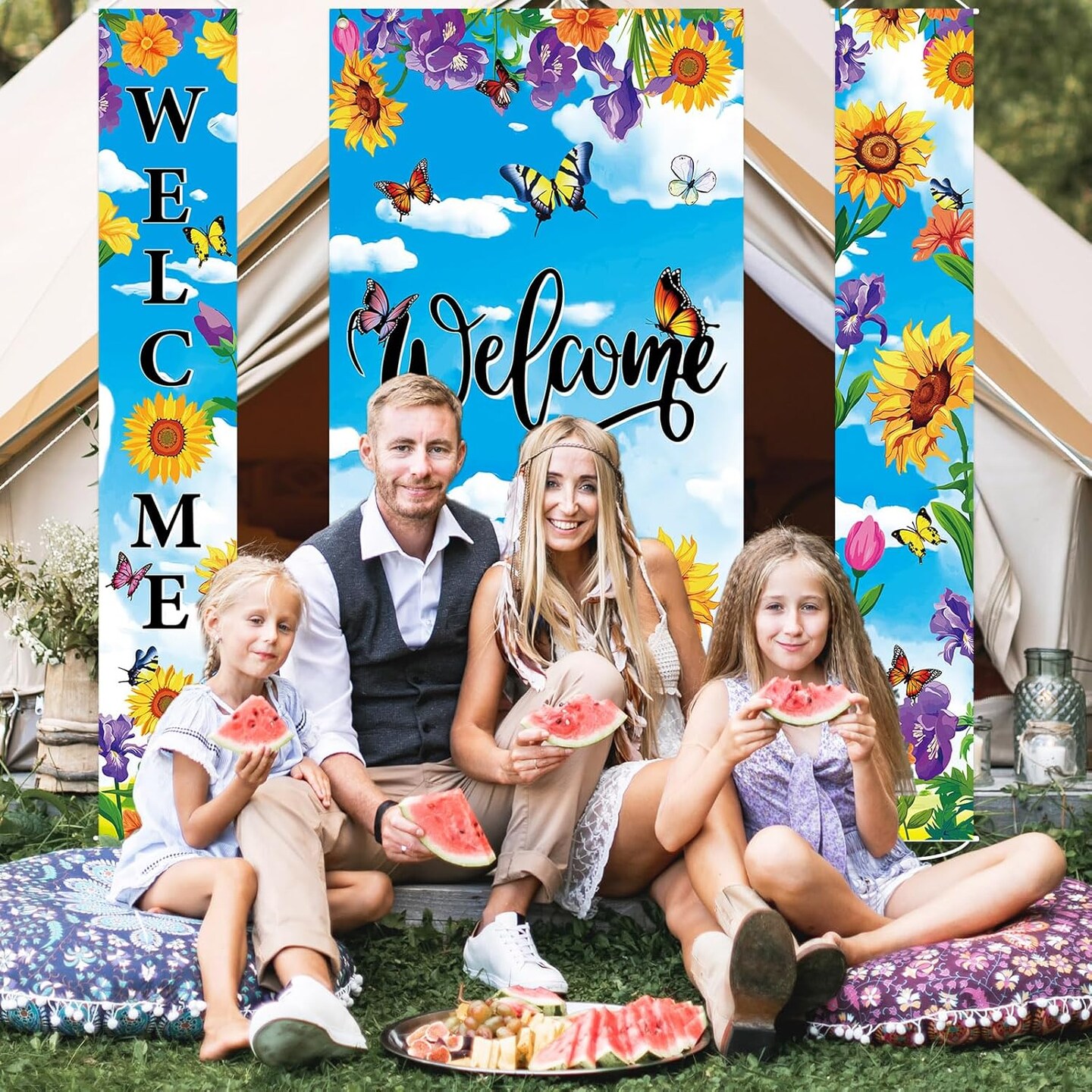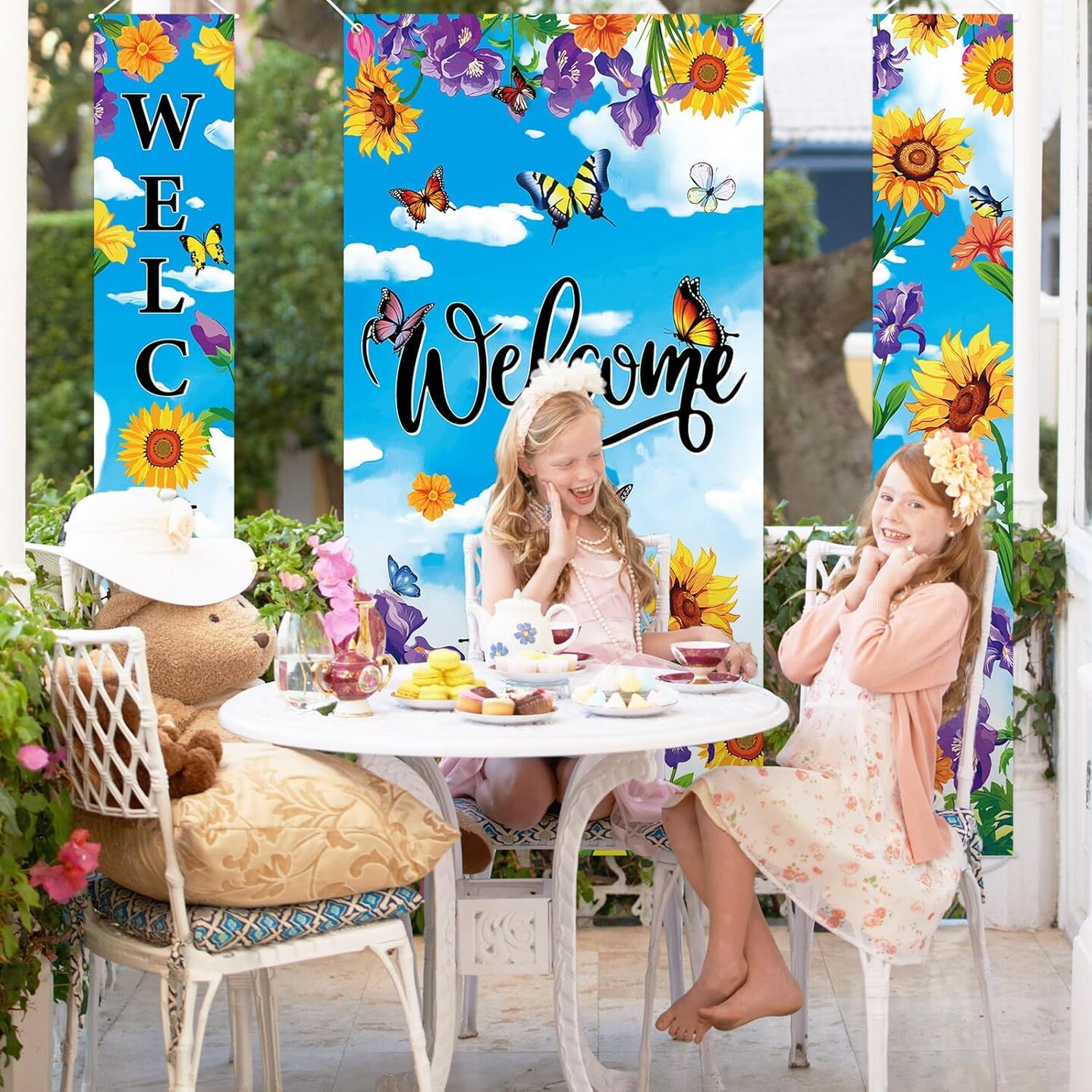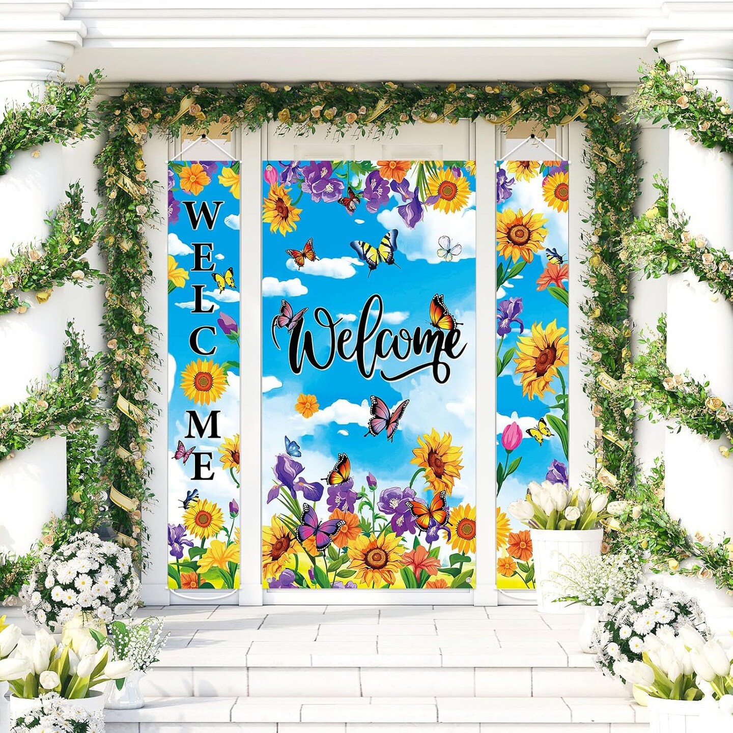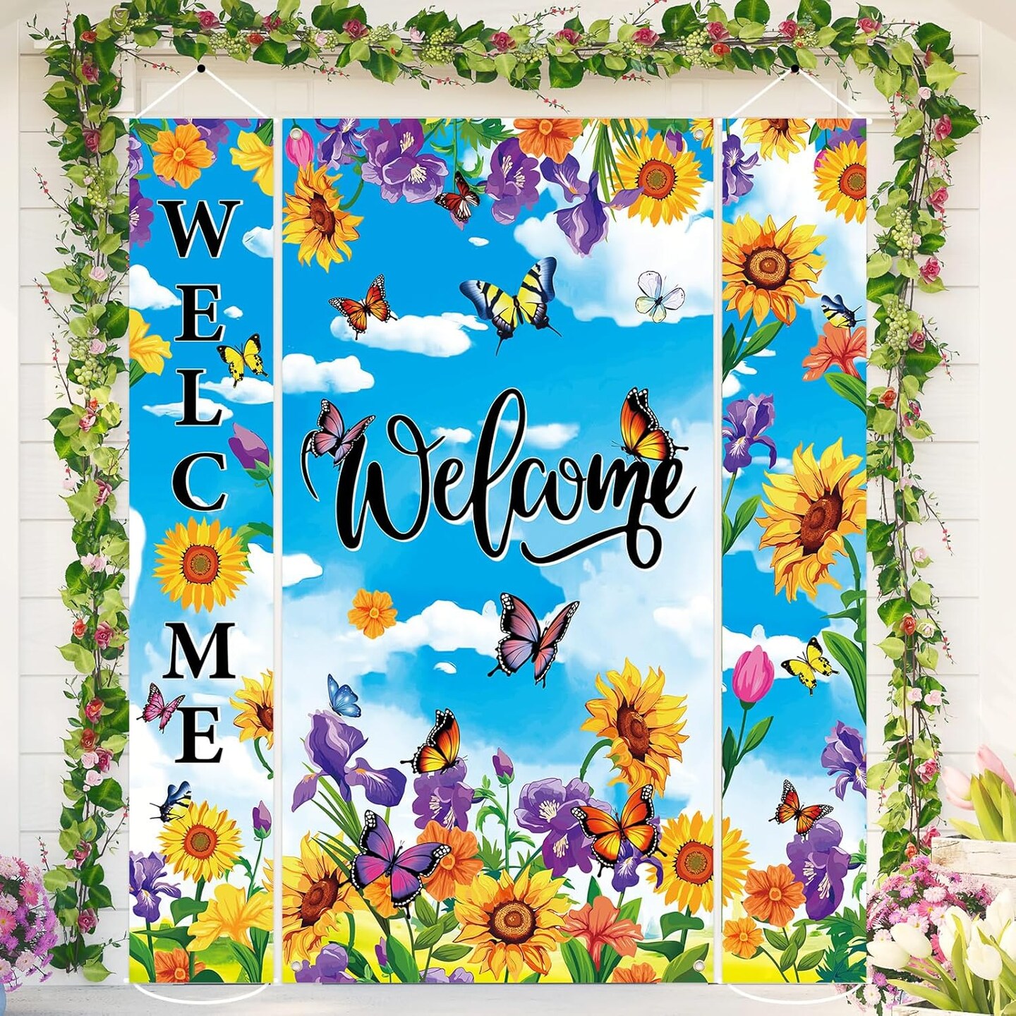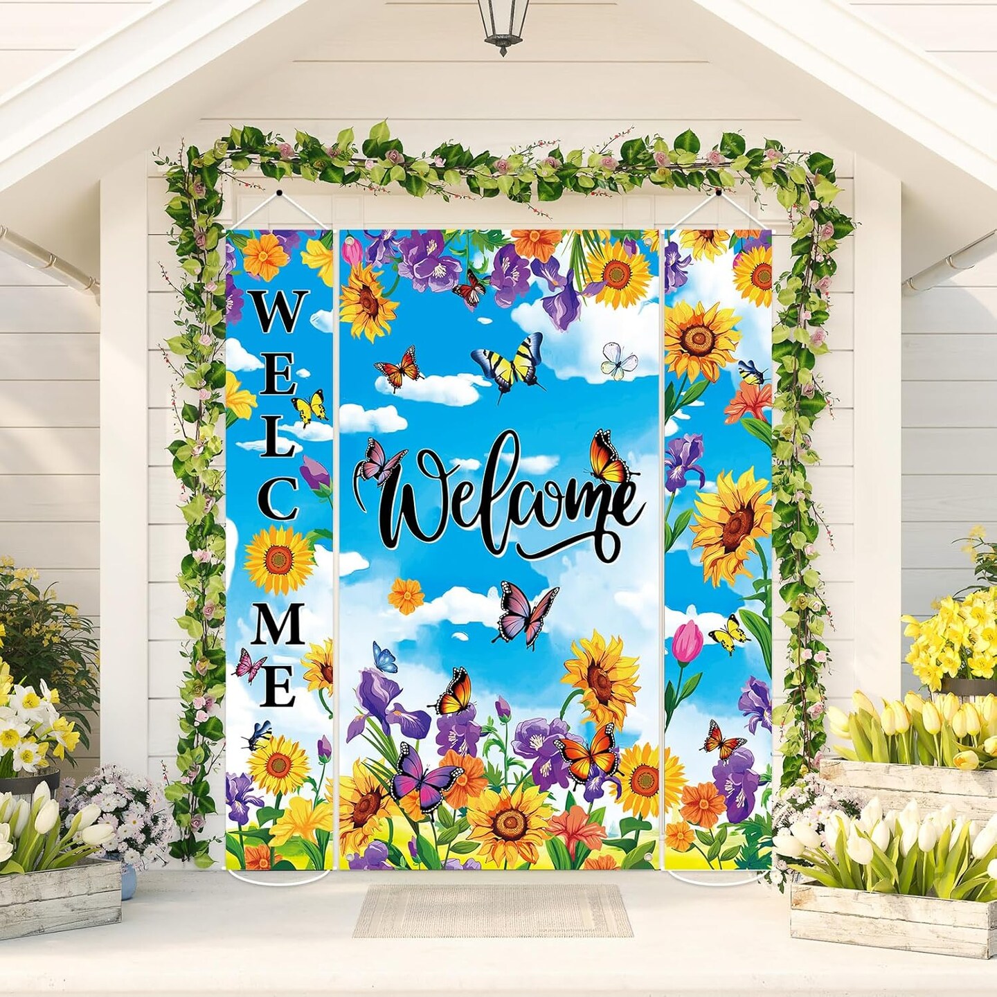 3Pcs Floral Welcome Door Cover Watercolor Flower Sunflower Butterfly Hanging Porch Banner for Spring Seasonal Indoor Outdoor Home Party Decor