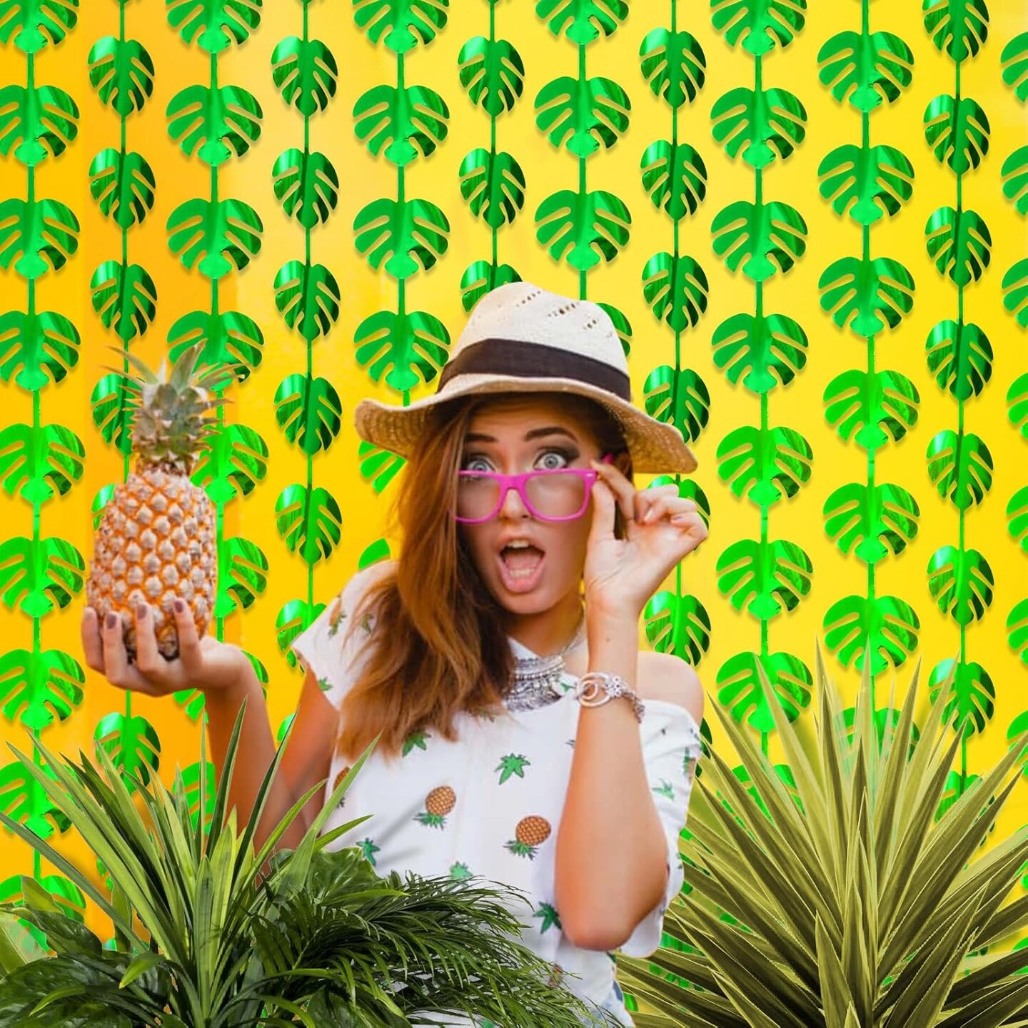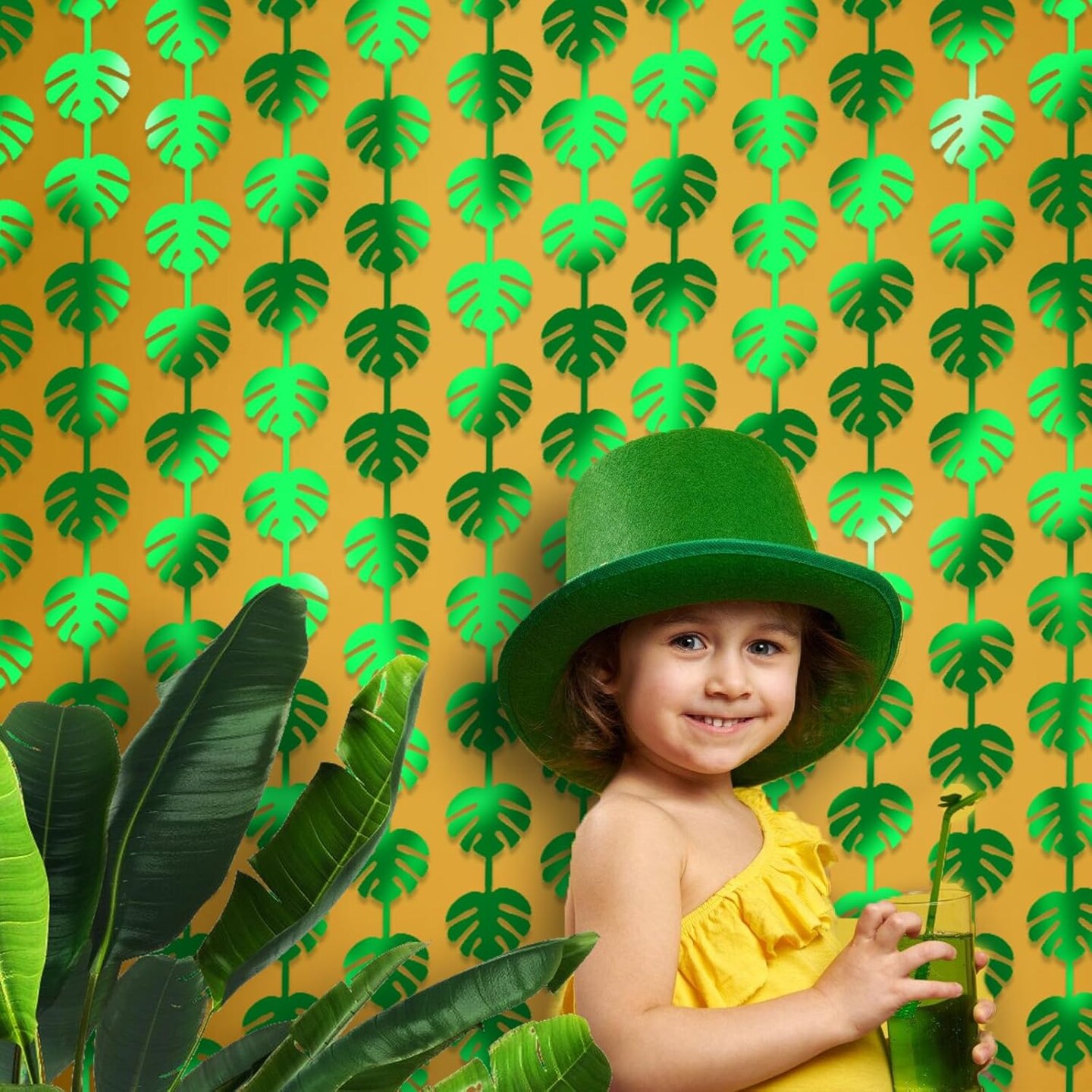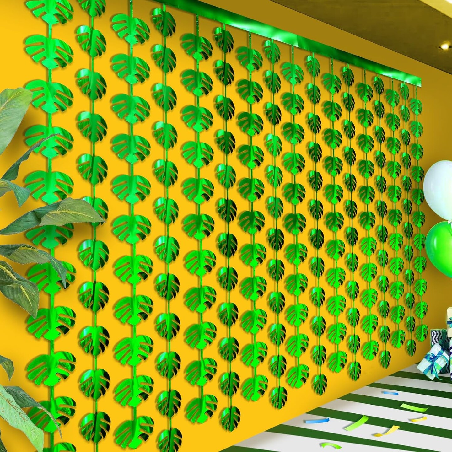 3Pcs Hawaiian Tropical Party Decorations Green Palm Leaves Garland 3.3X6.6Ft Foil Fringe Curtains Backdrops for Wild One Birthday, Safari, Luau, and Jungle Forest Dinosaur Parties