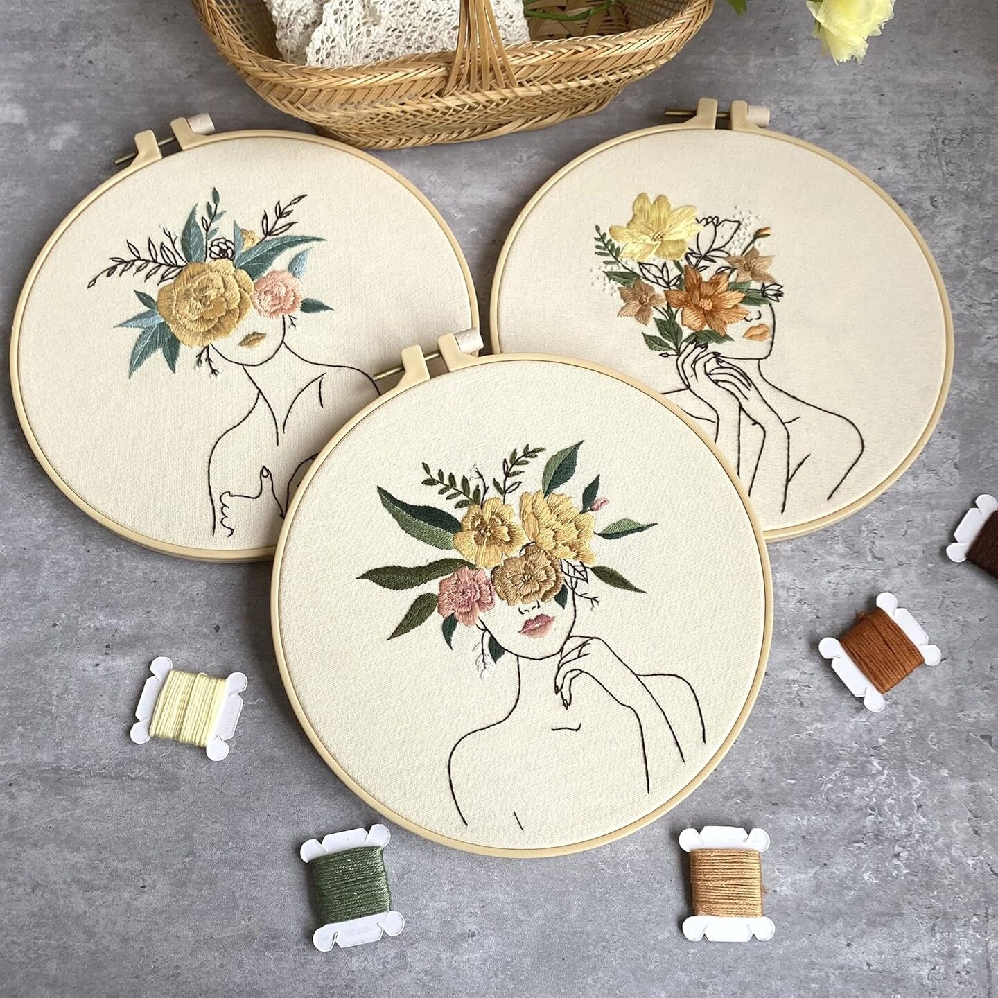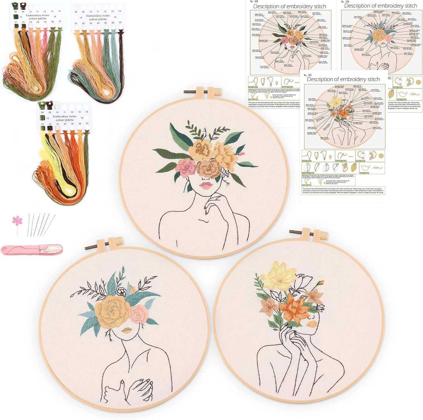 3-Piece Beginner Embroidery Kit – Floral & Plant Cross Stitch Set with Pre-Printed Cloth, 3 Hoops, and Color Threads