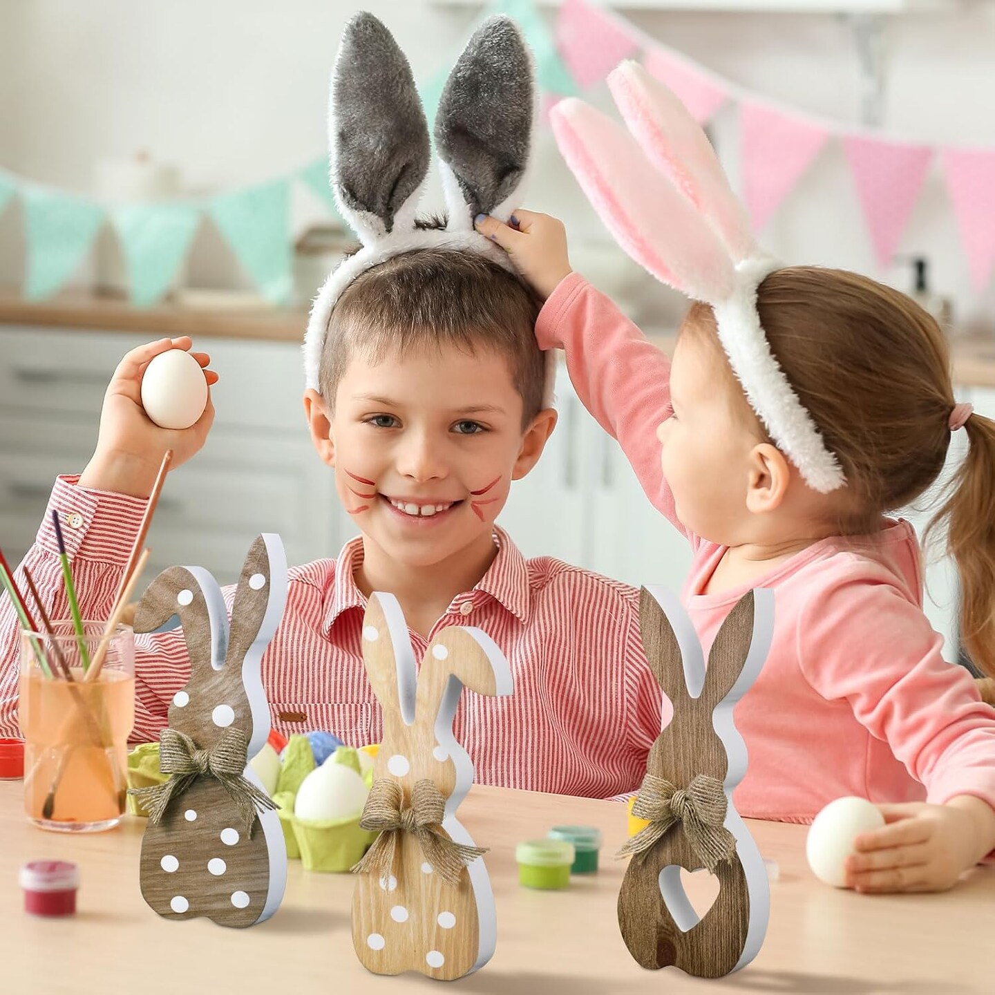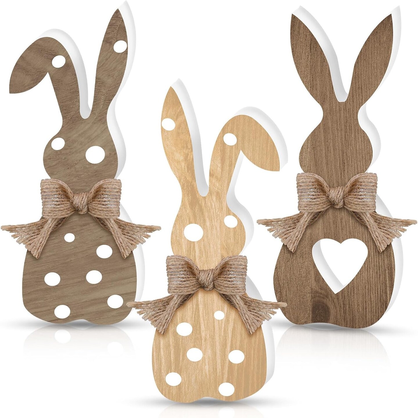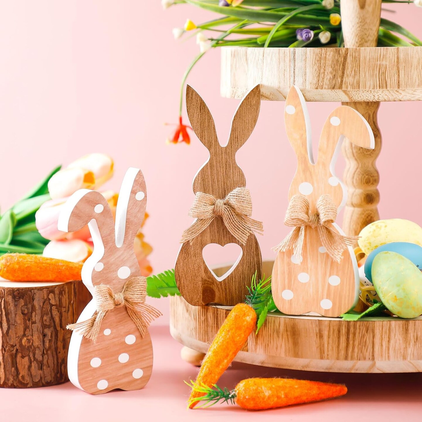 3-Piece Easter Bunny Table Decorations – Wooden Farmhouse Tiered Tray Decor, Rustic Rabbit Centerpiece for Spring Home & Party Tabletop (Natural Brown)