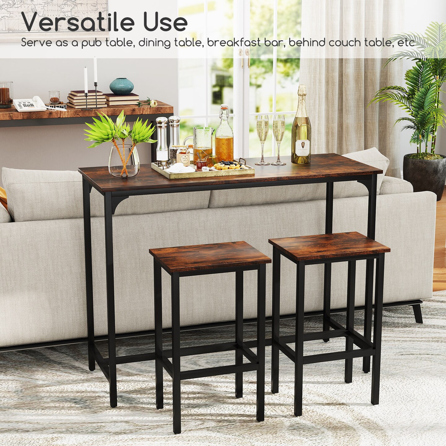 3-Piece Industrial Dining Set with 47.5 Inch Table and 2 Bar Stools