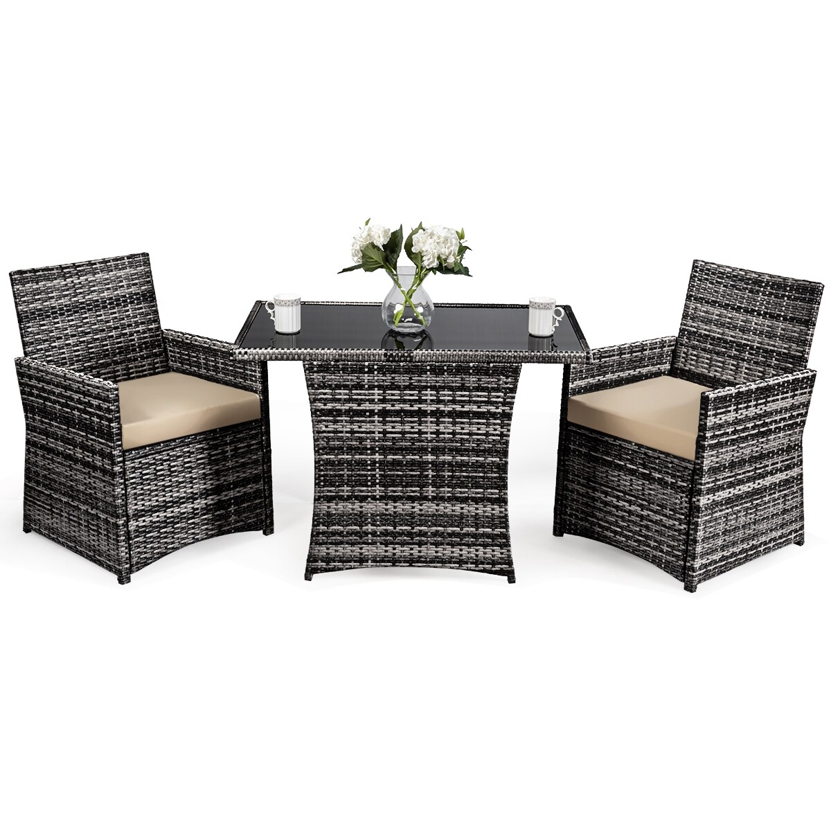 3-Piece Outdoor Rattan Patio Set Steel Frame Table 2 Chairs With Cushions Brown
