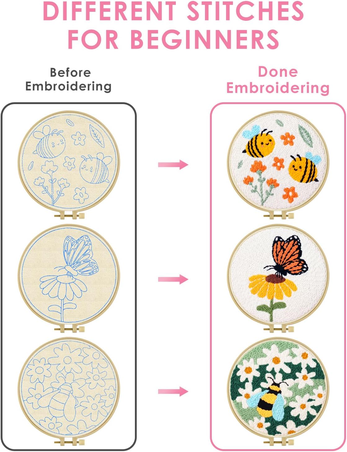 3-Set Flower Punch Needle Kit for Beginners – DIY Embroidery Kit with Pre-Printed Fabric, Hoop, Yarn, Punch Needle & Sewing Tools, Fun Craft Set for Adults & Kids
