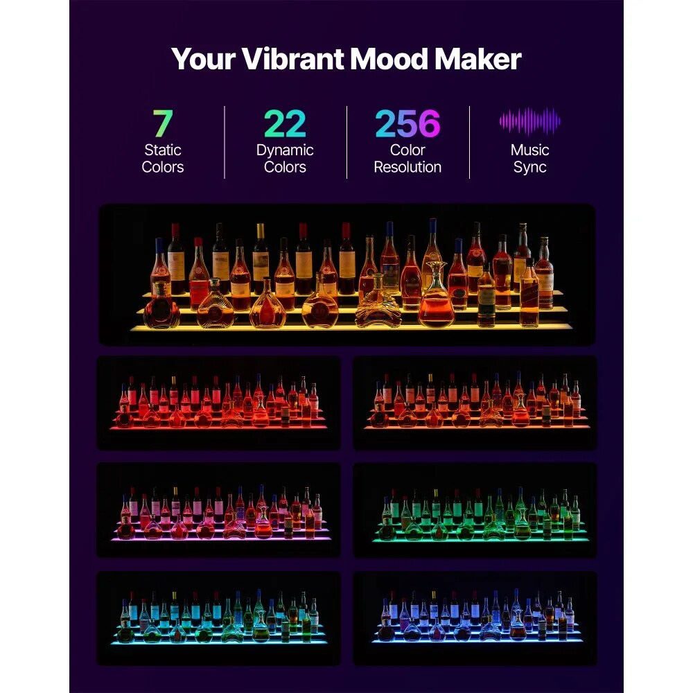3-Tier LED Liquor Bottle Display Illuminated Acrylic Shelf RF Remote App 7 Colors