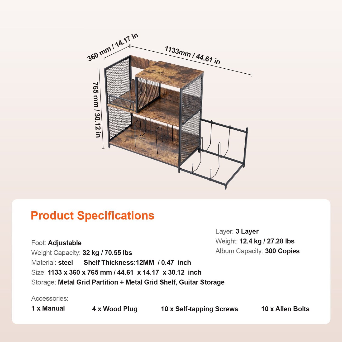 3-Tier Turntable Vinyl Record Shelf with Guitar Storage and Metal Grid Partition Adjustable Floor Feet