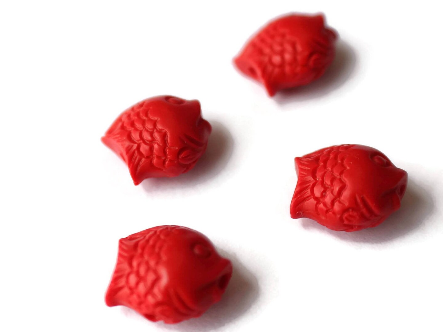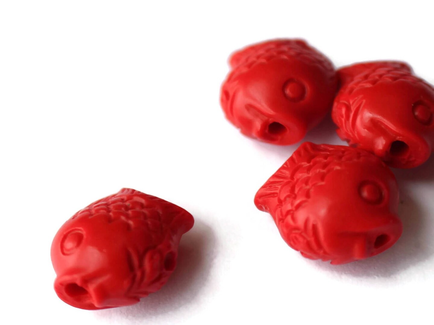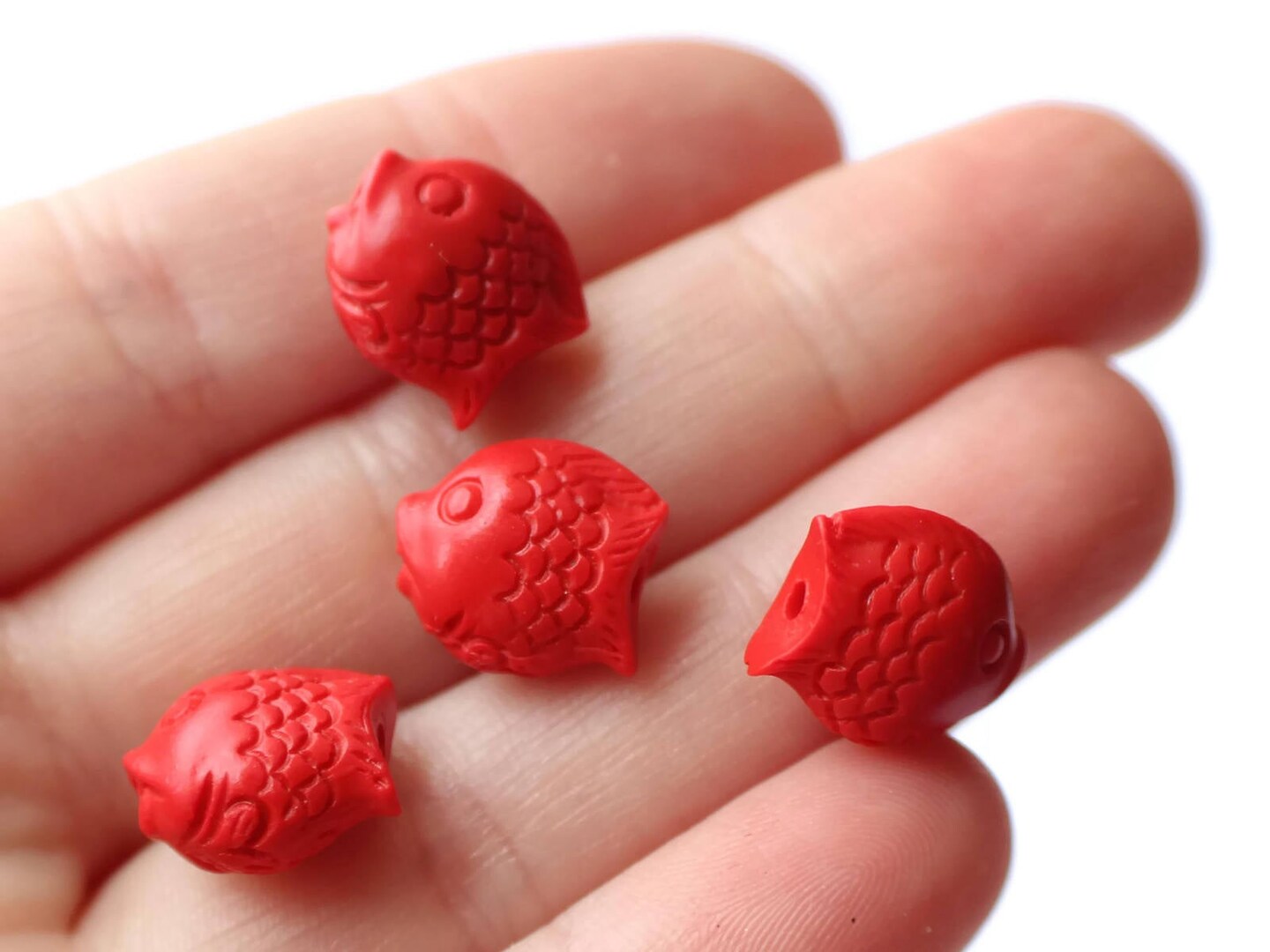 4 13mm Carved Cinnabar Fish Beads Red Lacquer Beads
