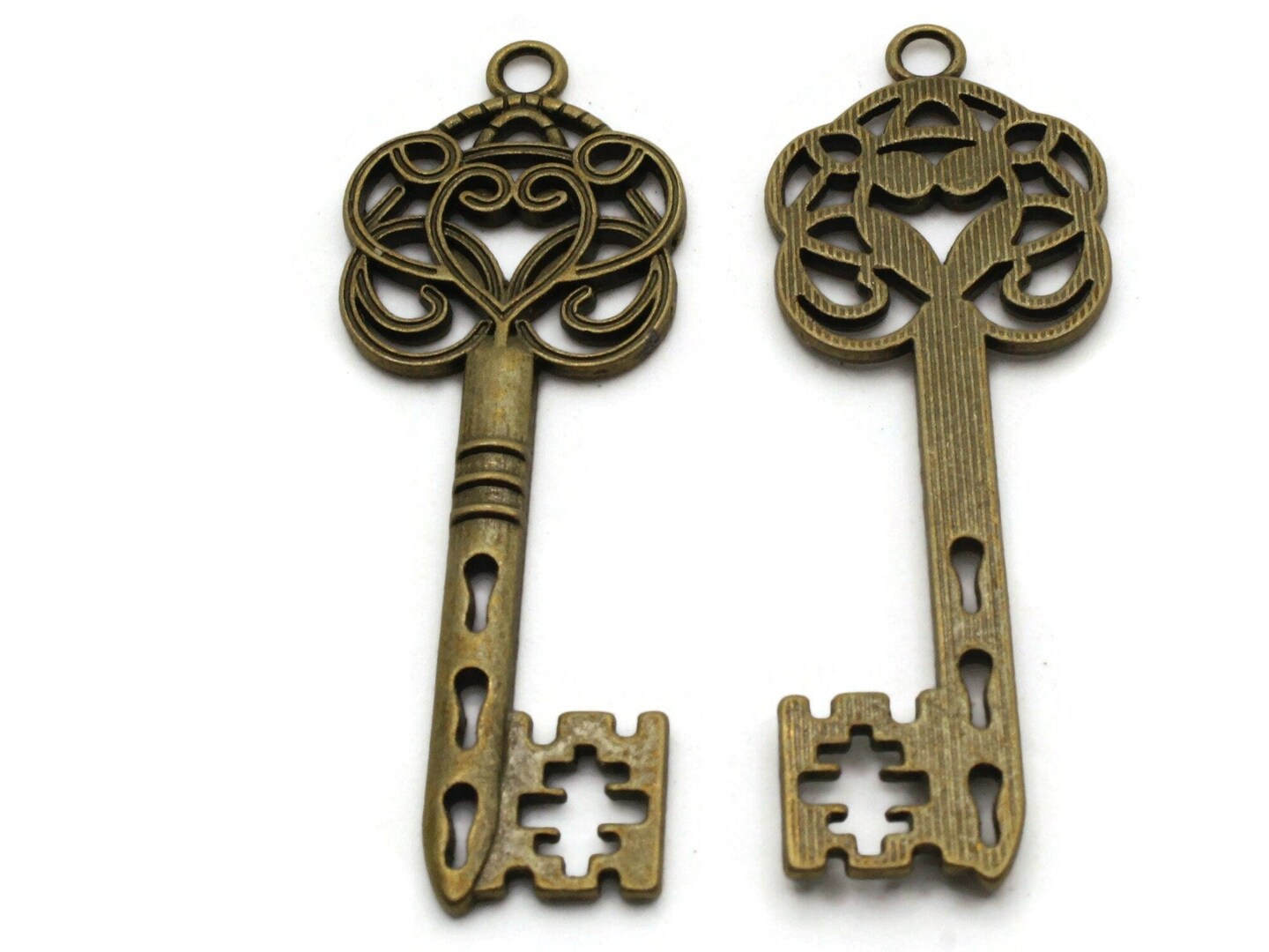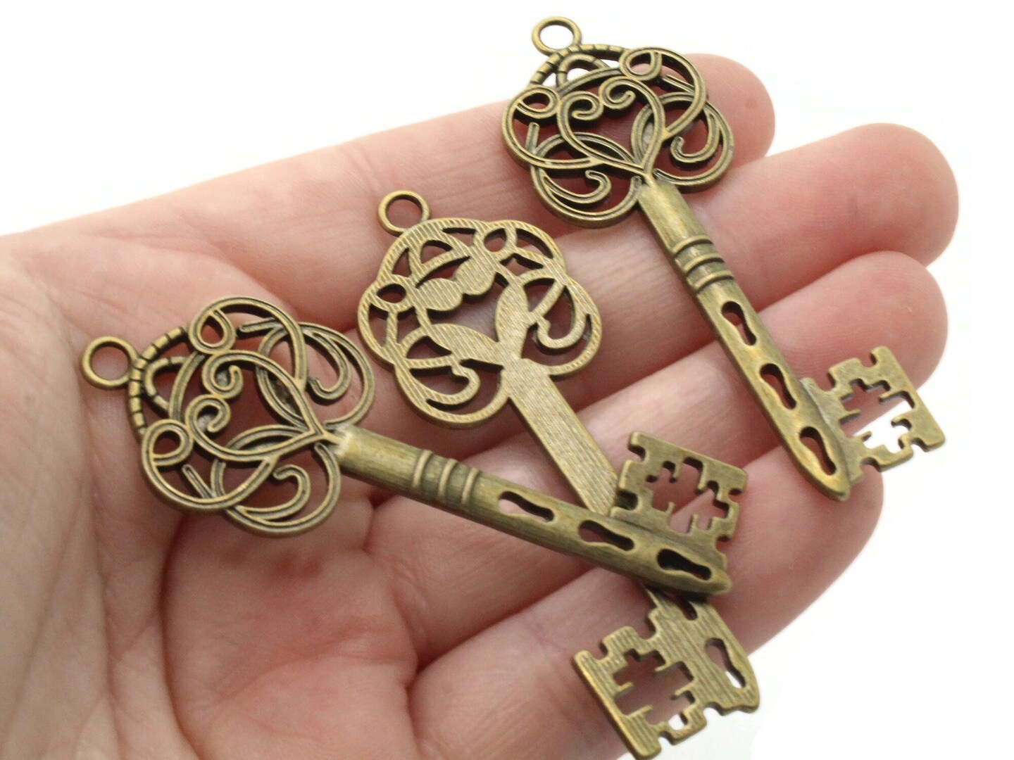 4 60mm Antique Bronze Classic Filigree Heart Metal Skeleton Key Charms