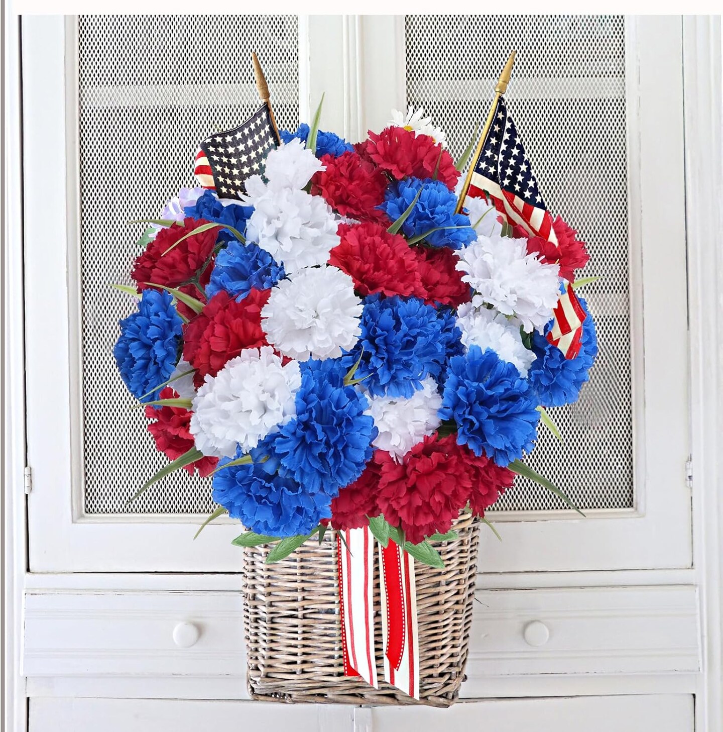 4 Bundles 4th of July Red White and Blue Fake Ball Chrysanthemum Silk Arrangement Headstone Flowers for Cemetery Patriotic Vase Home Spring Centerpieces(17INCH)