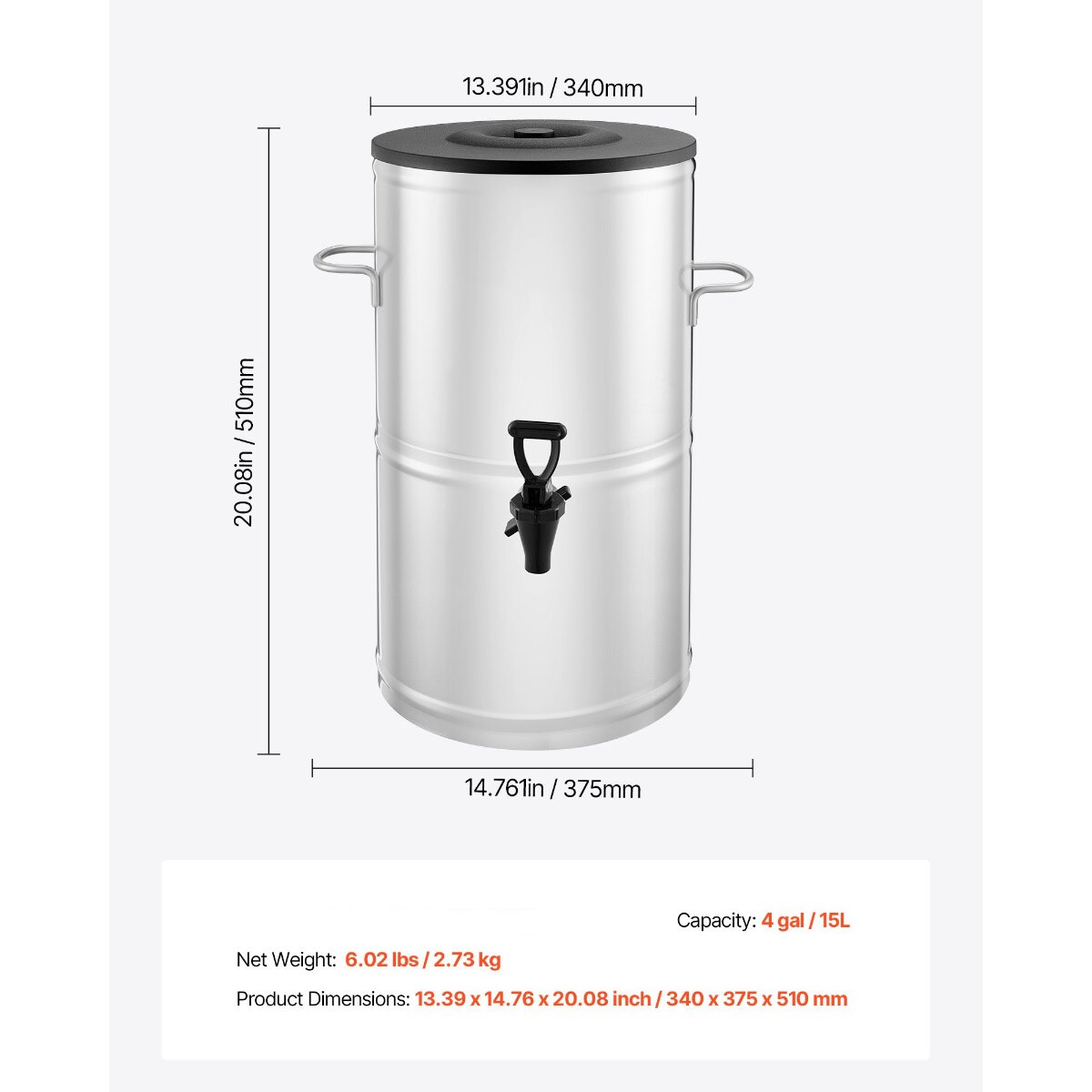 4 Gal Stainless Steel Iced Tea Dispenser with Spigot and Handle