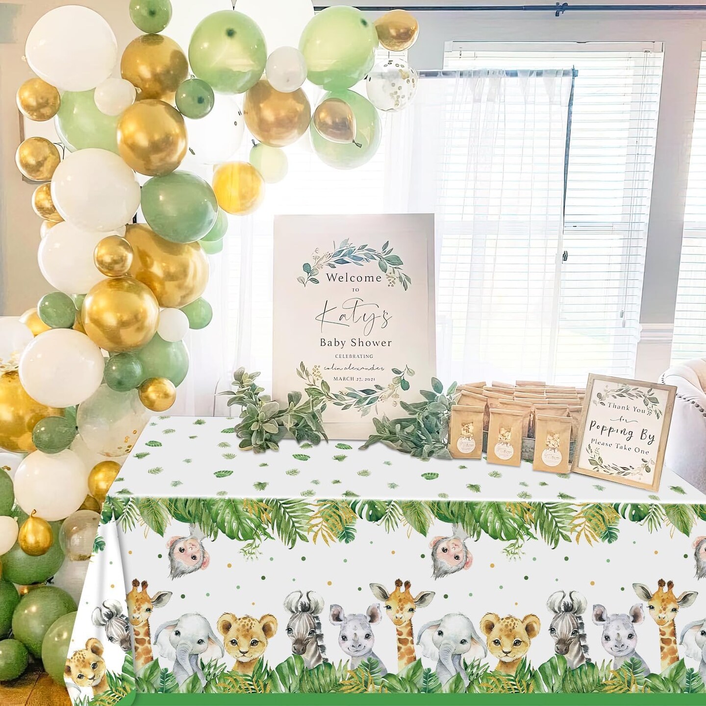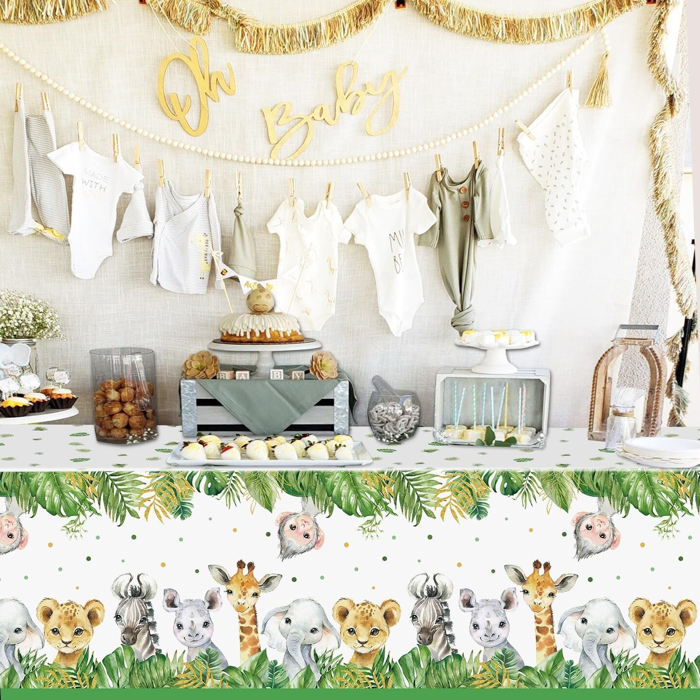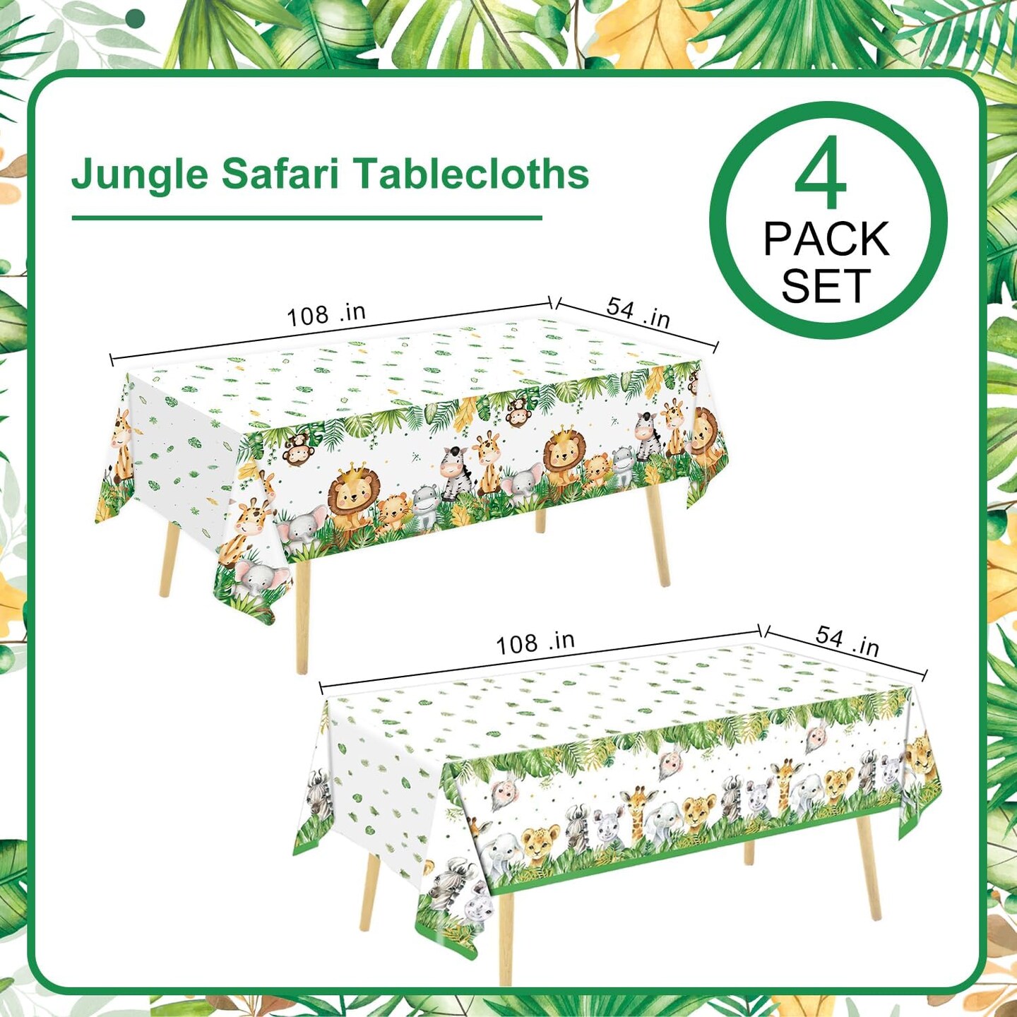 4 Pack Animals Plastic Plastic Table Cloth for Sage Green Safari Baby Shower Decorations, 108×54 Inch