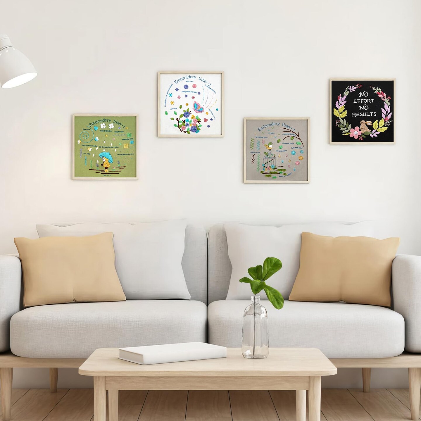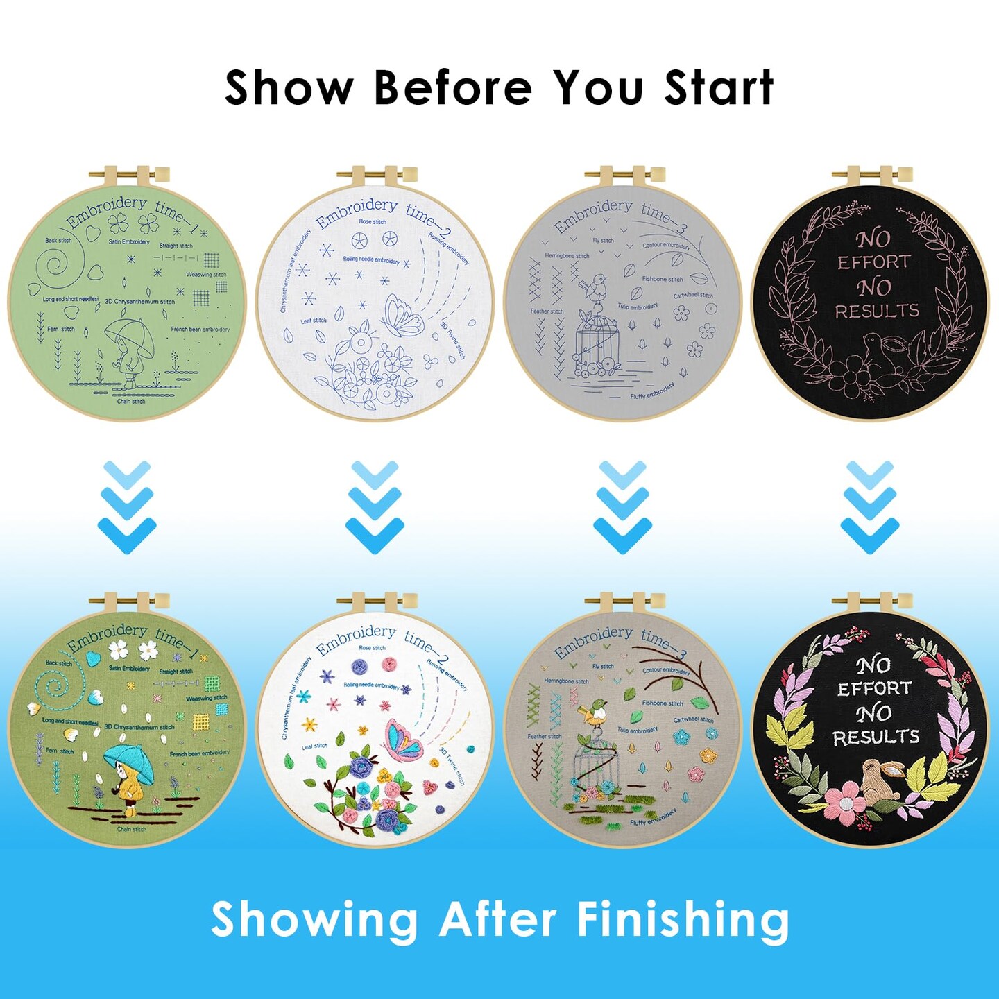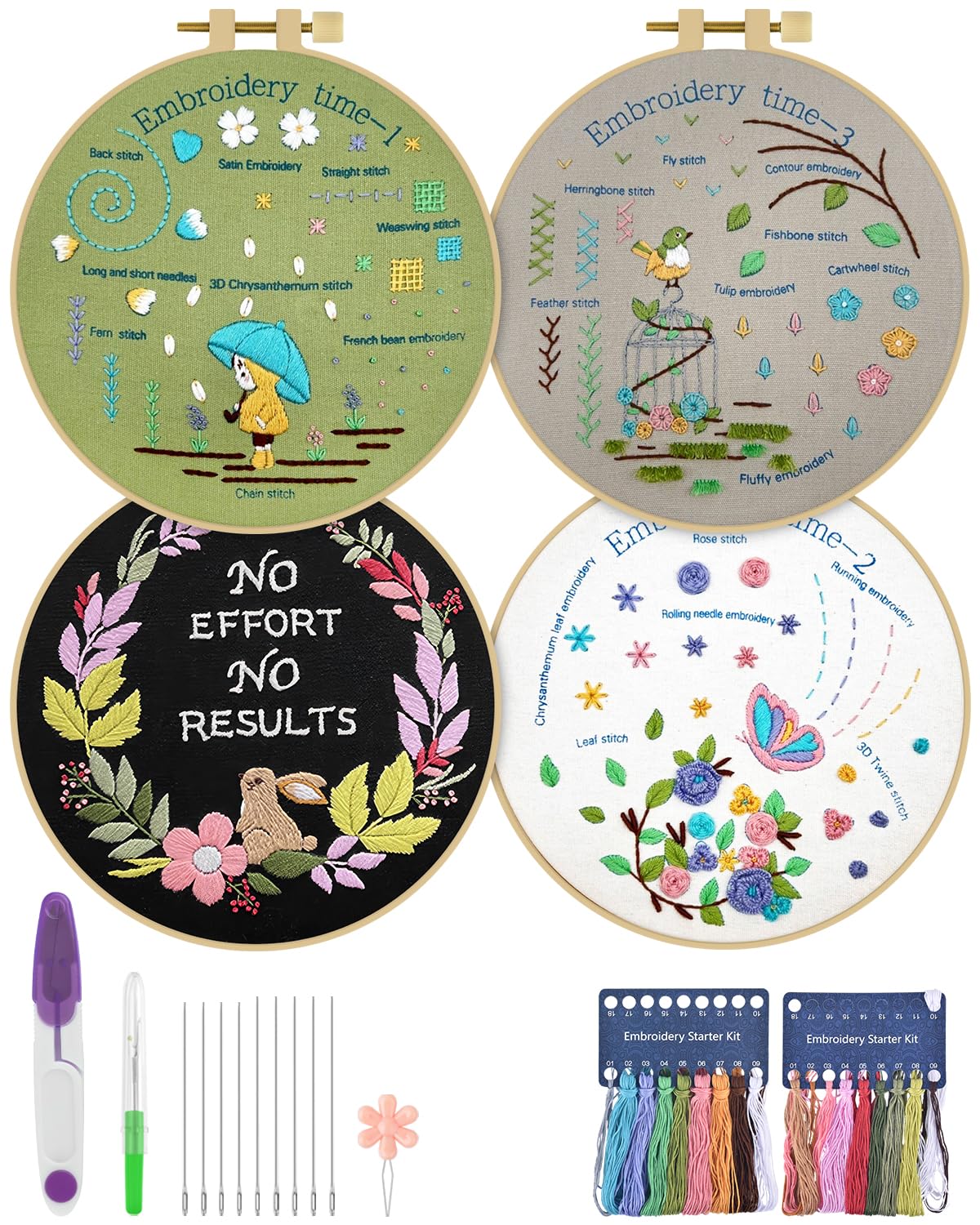 4 Pack Beginner Embroidery Kits for Adults DIY Starter Kit with 33 Stitch Techniques, Stamped Patterns, Embroidery Hoop, Colorful Threads, Tools, Step by Step Instructions & Video Tutorial