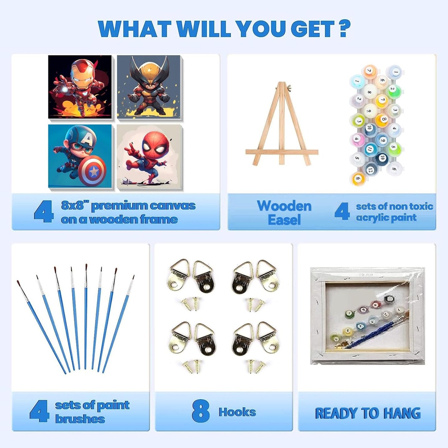 4 Pack Cartoon Paint by Numbers for Kids with Framed Canvas-with Wooden Easel, Paint by Number for Kids Ages 4-8-12, DIY Easy Acrylic Oil Painting Kits for Home Wall Decor (8X8inch)