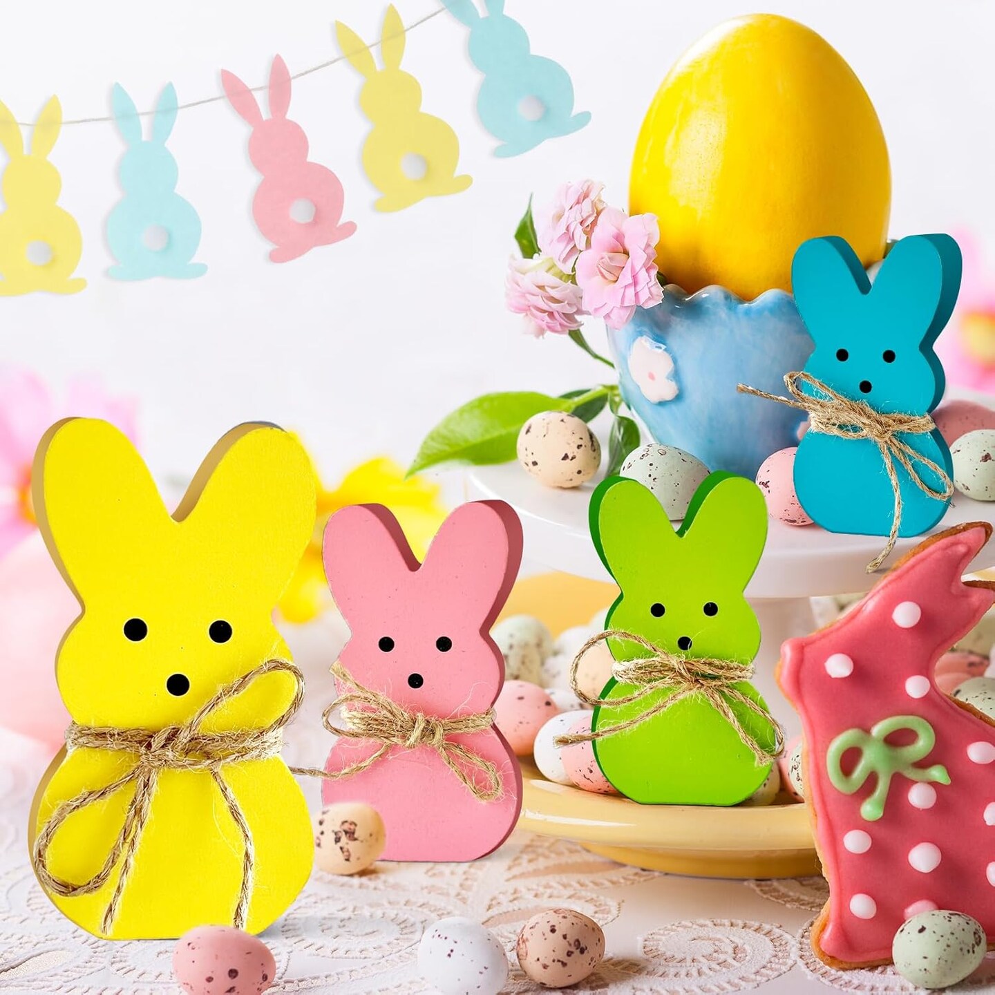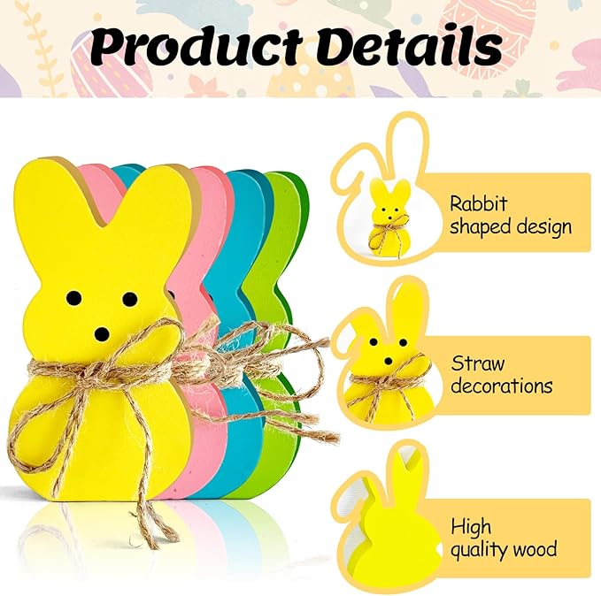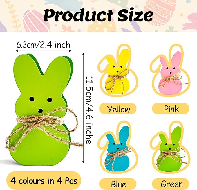 4 Pack Easter Day Bunny Peeps Table Decorations - 4.6x2.4 Inches Cute Wooden Rabbit Tiered Tray & Tabletop Centerpieces, Rustic Farmhouse Sign Basket Gifts Decor