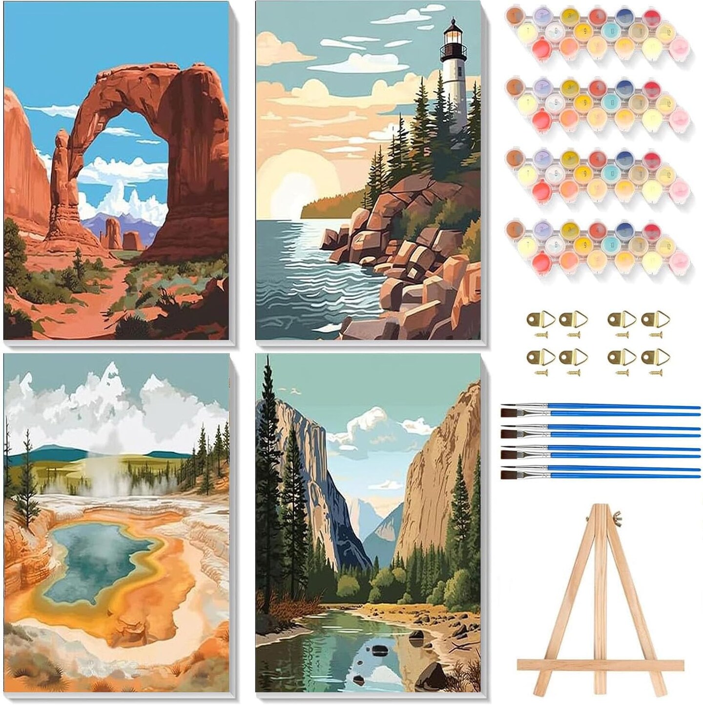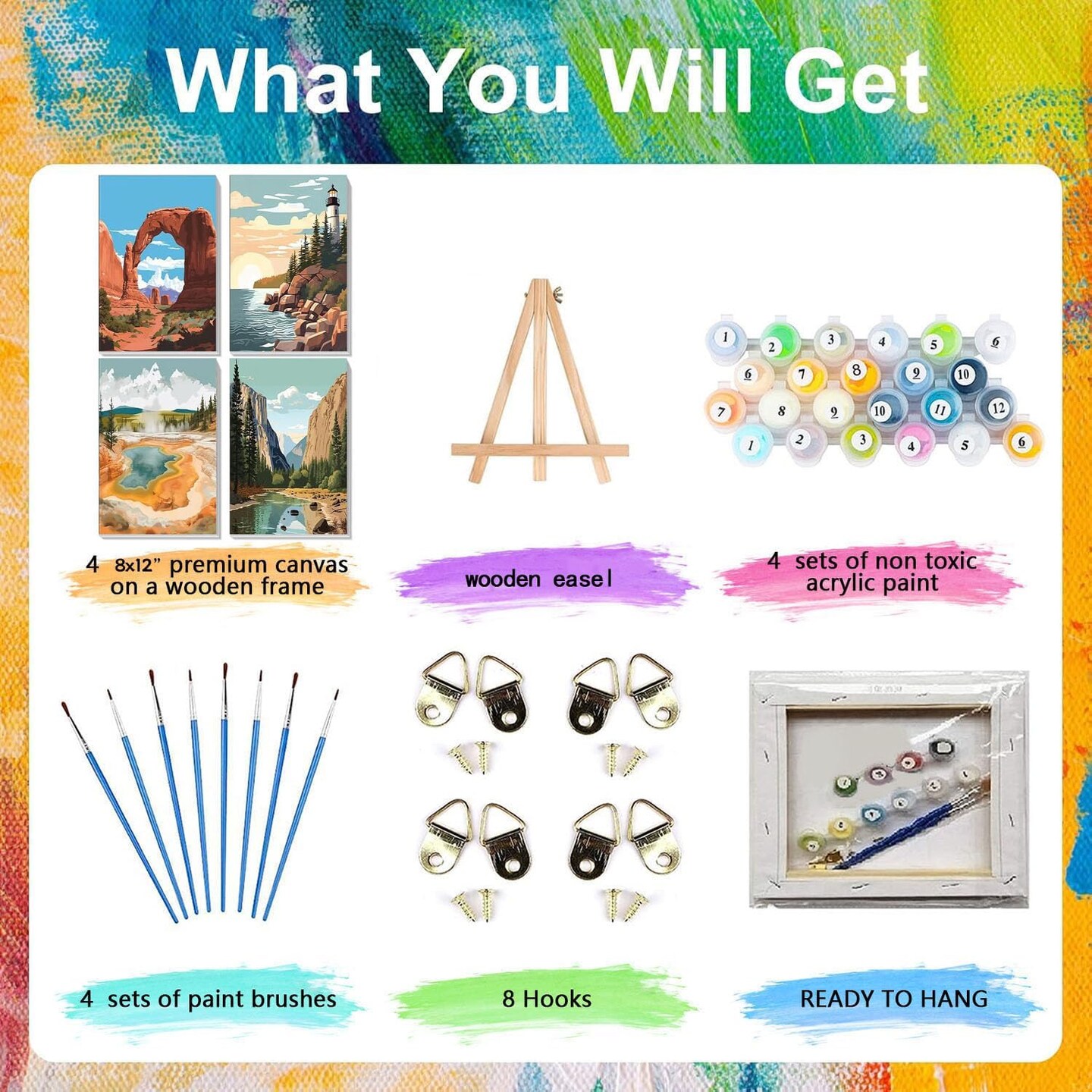 4 Pack Paint by Numbers for Adults with Framed Canvas (8x12 inch)