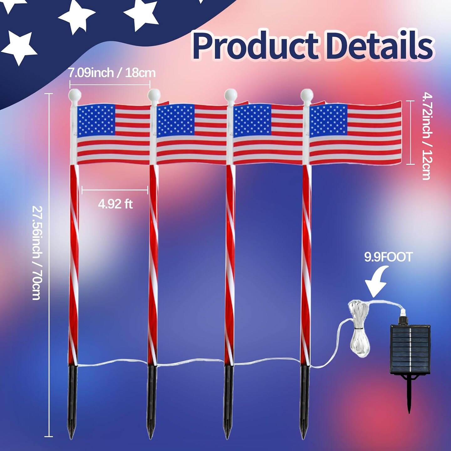 4 Pack Solar American Flag Lights - Outdoor 4th of July Yard Decorations, 1200mAh Garden Flag Lights, 27in Waterproof USA Flag Pathway Light,Independence Day & Memorial Day Lawn Decor
