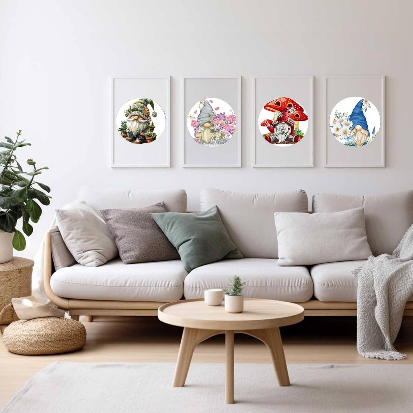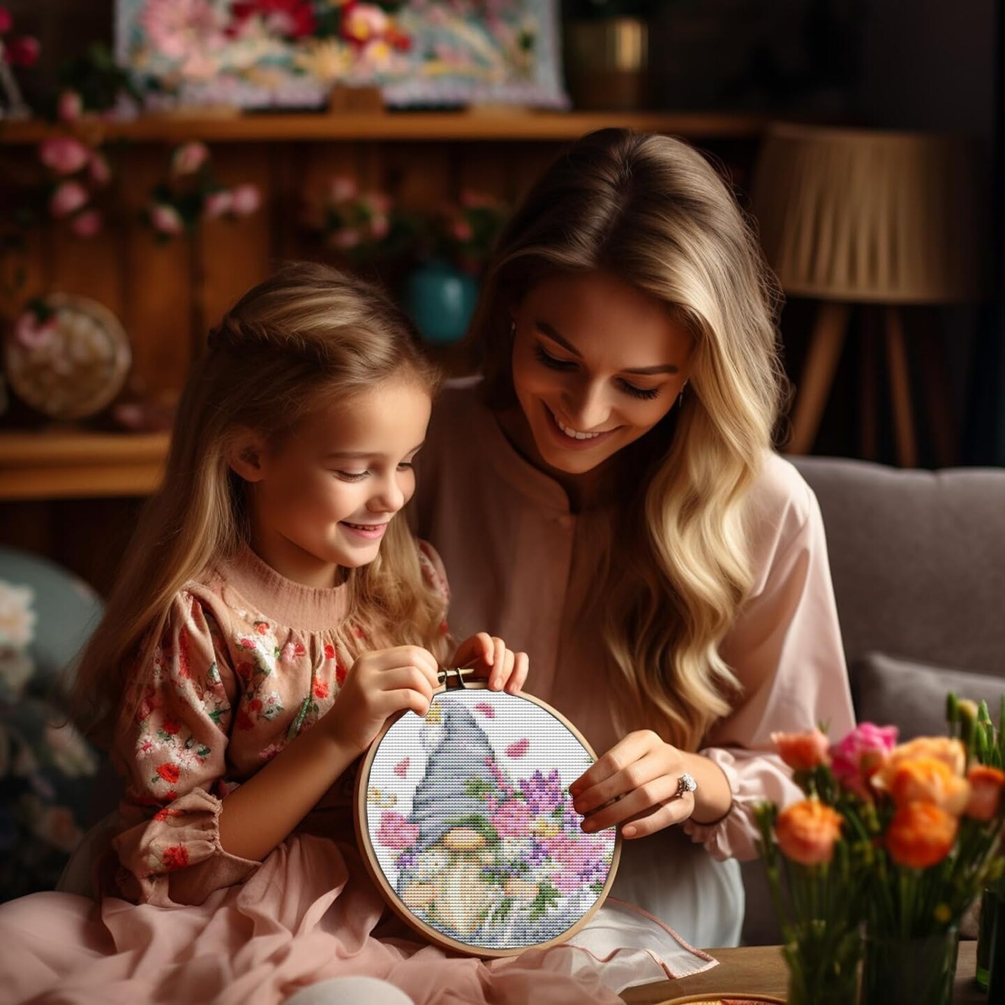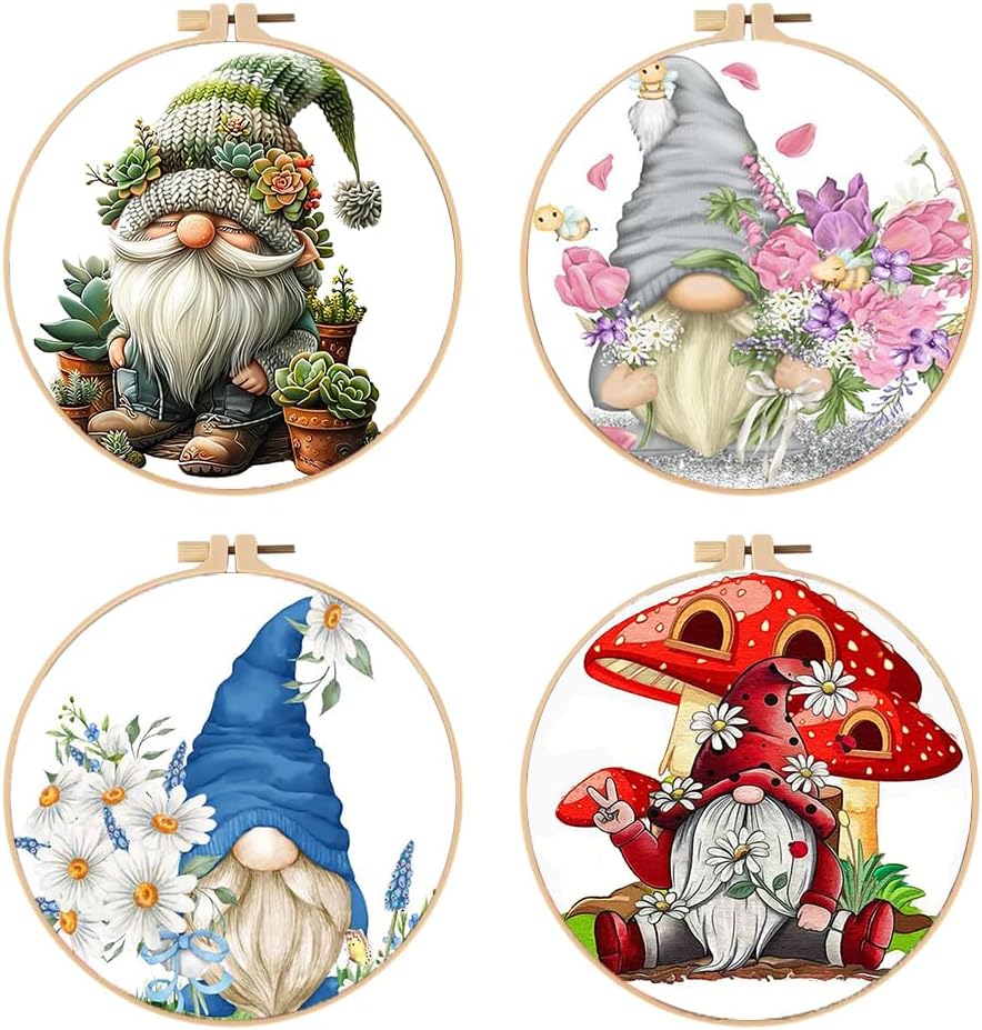 4 Pack Stamped Cross Stitch Kits for Adults with Frame - Gnome Flower Embroidery Kits for Beginners Adults