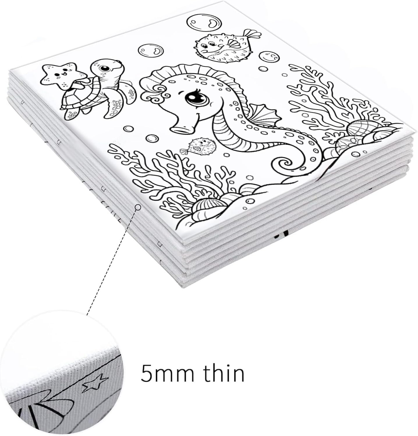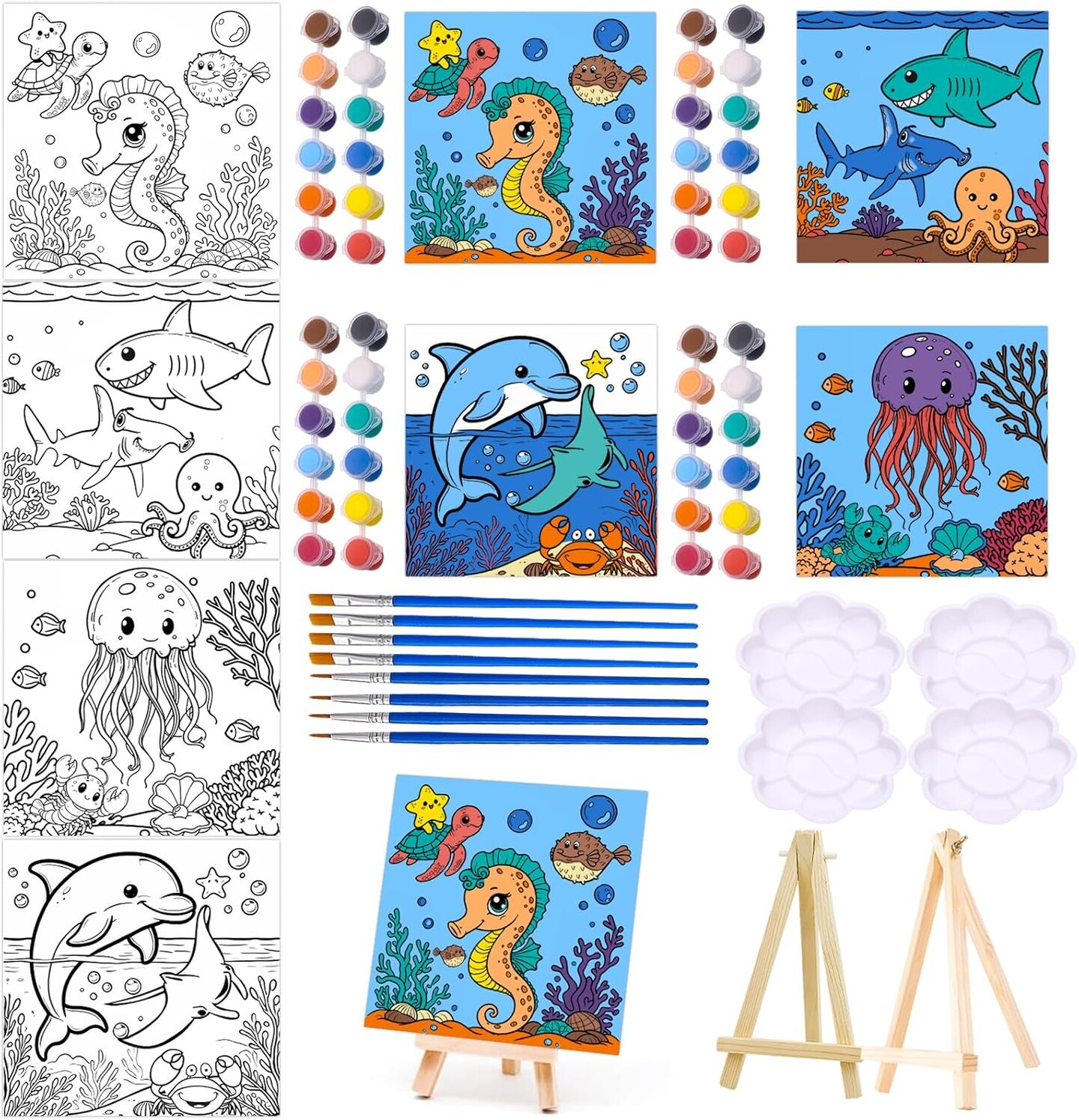 4 Packs 7.8x7.8 Pre Drawn Canvas Paint Set,Paint by Numbers for Kids,48 Paints 8 Brushes 2 Easels