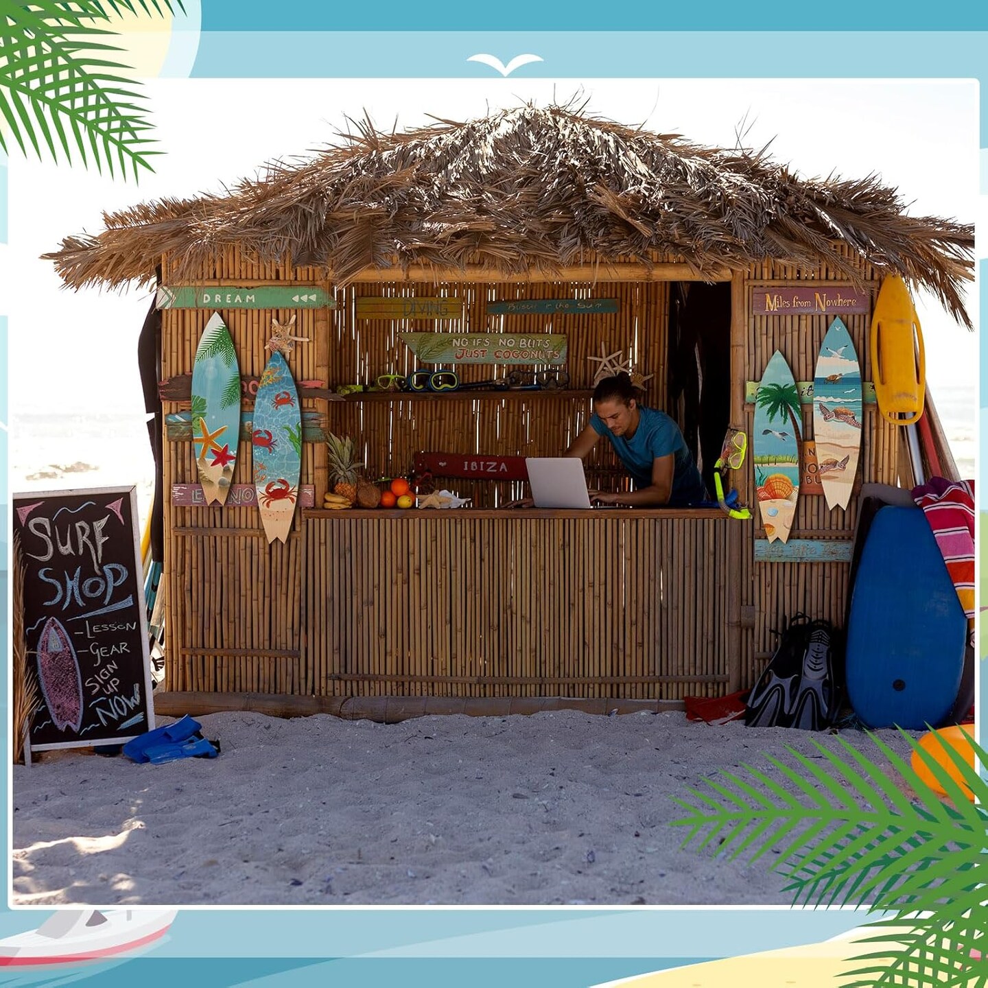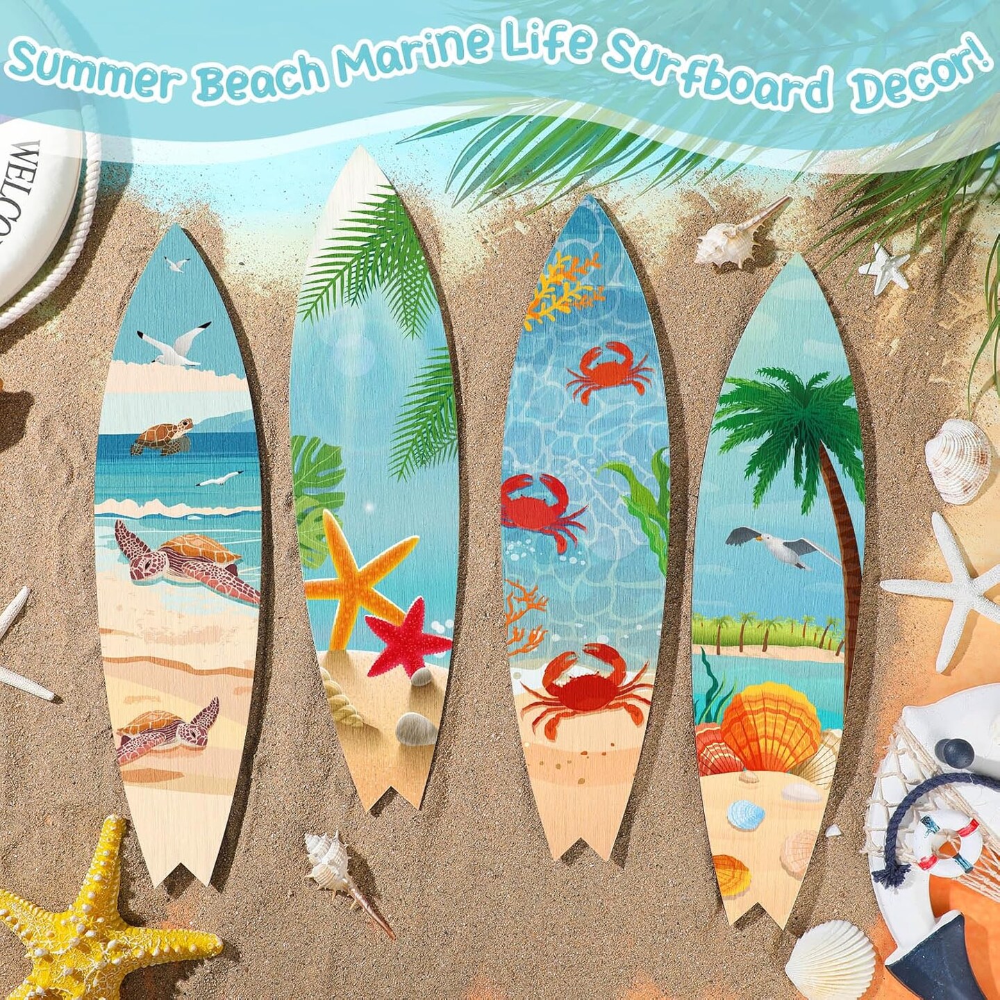 4 Pcs 15.75 x 3.94 Inch Beach Surfboard Wall Decor Wooden Summer Marine Life Surfboard Wall Hanging Sign Sea Turtle Starfish Shell Crab Summer Theme Decor for Hawaiian Luau Birthday Party