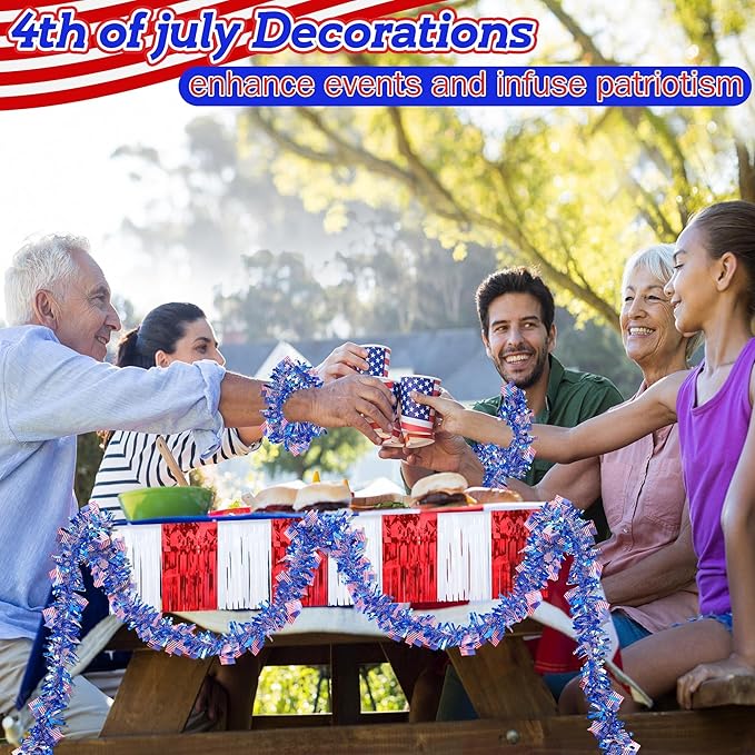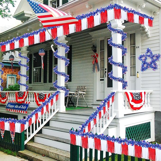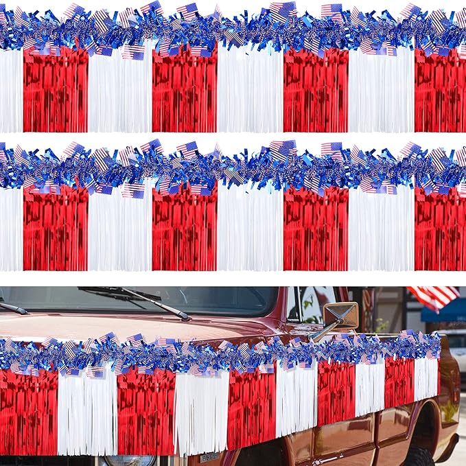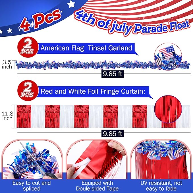 4 Pcs 4th of July Parade Float Decorations, American Flag Float Fringes and Patriotic Tinsel Garlands, Red White Blue Garland for Independence Day Memorial Day Decoration (American Flag)
