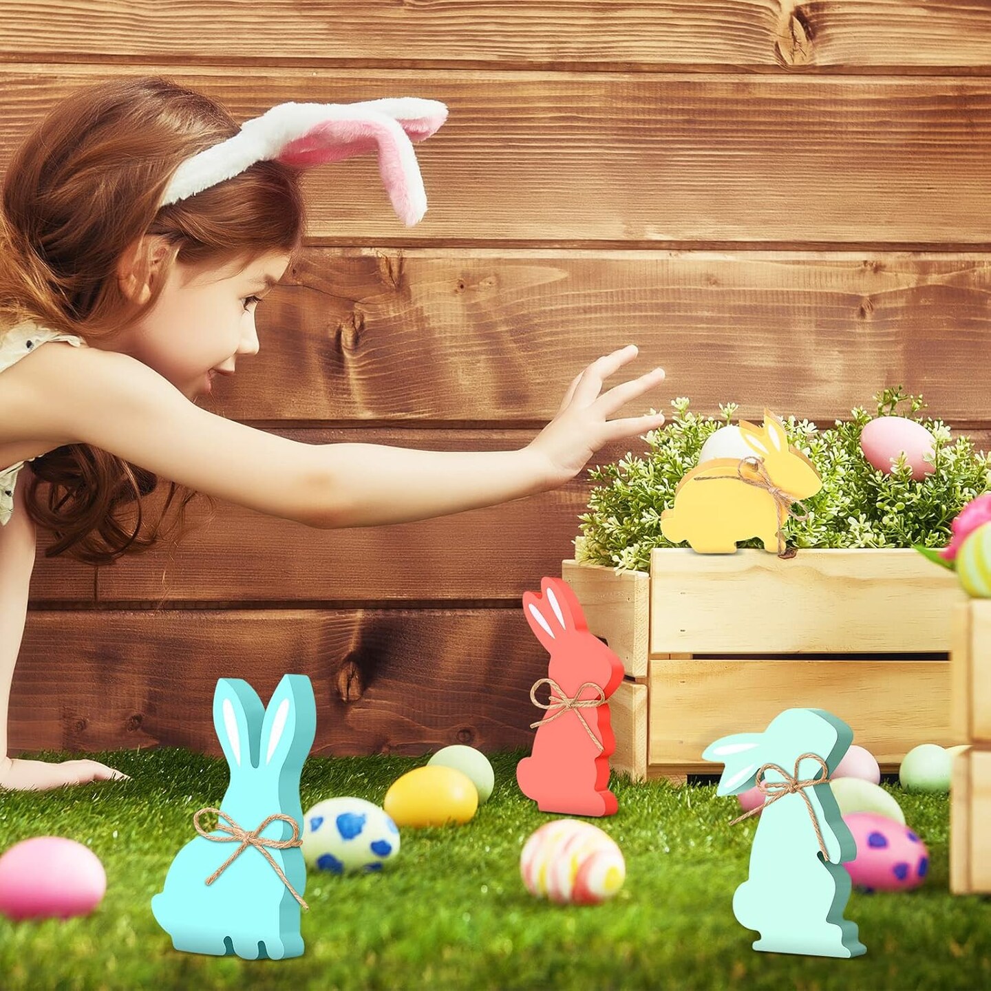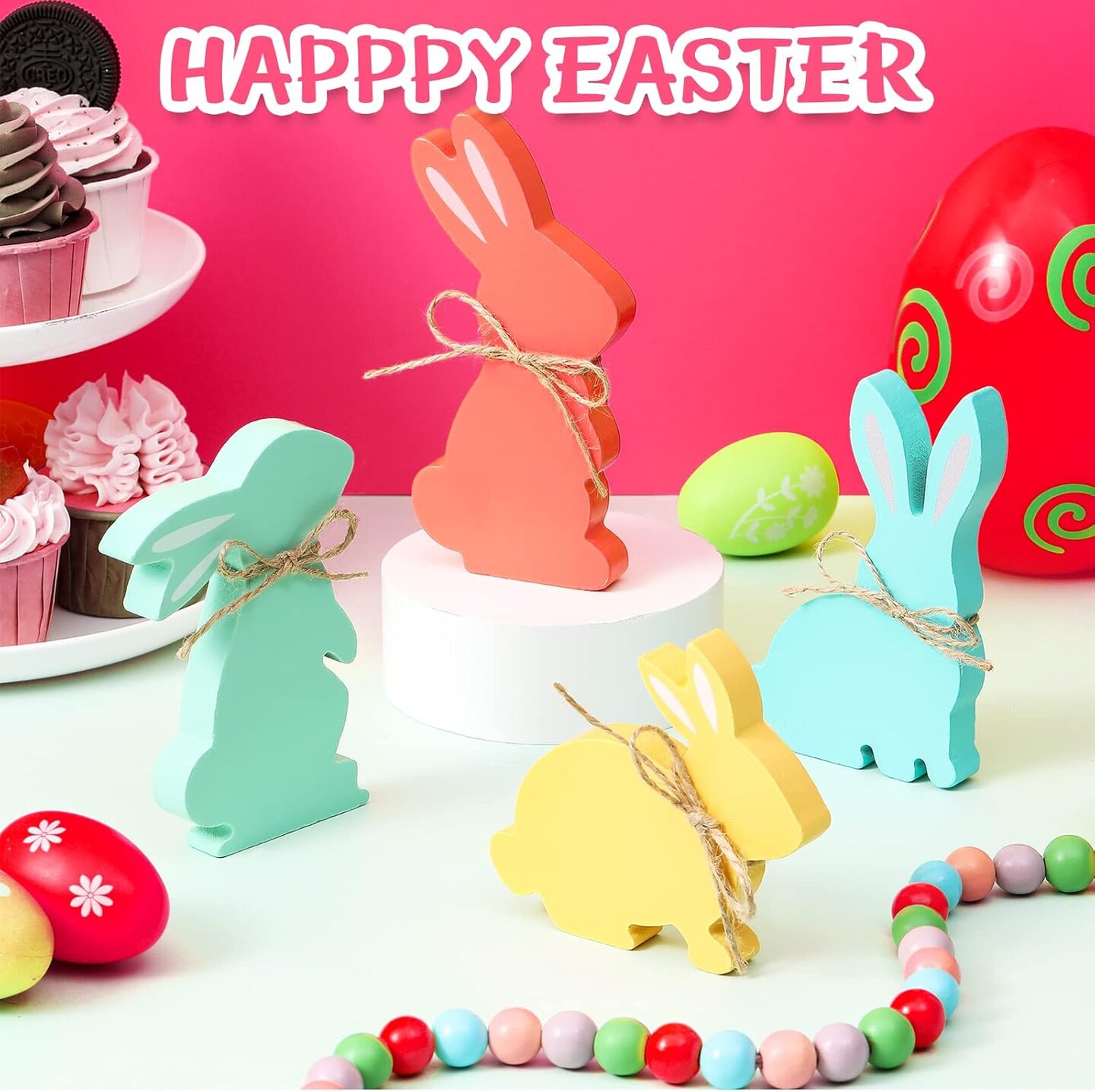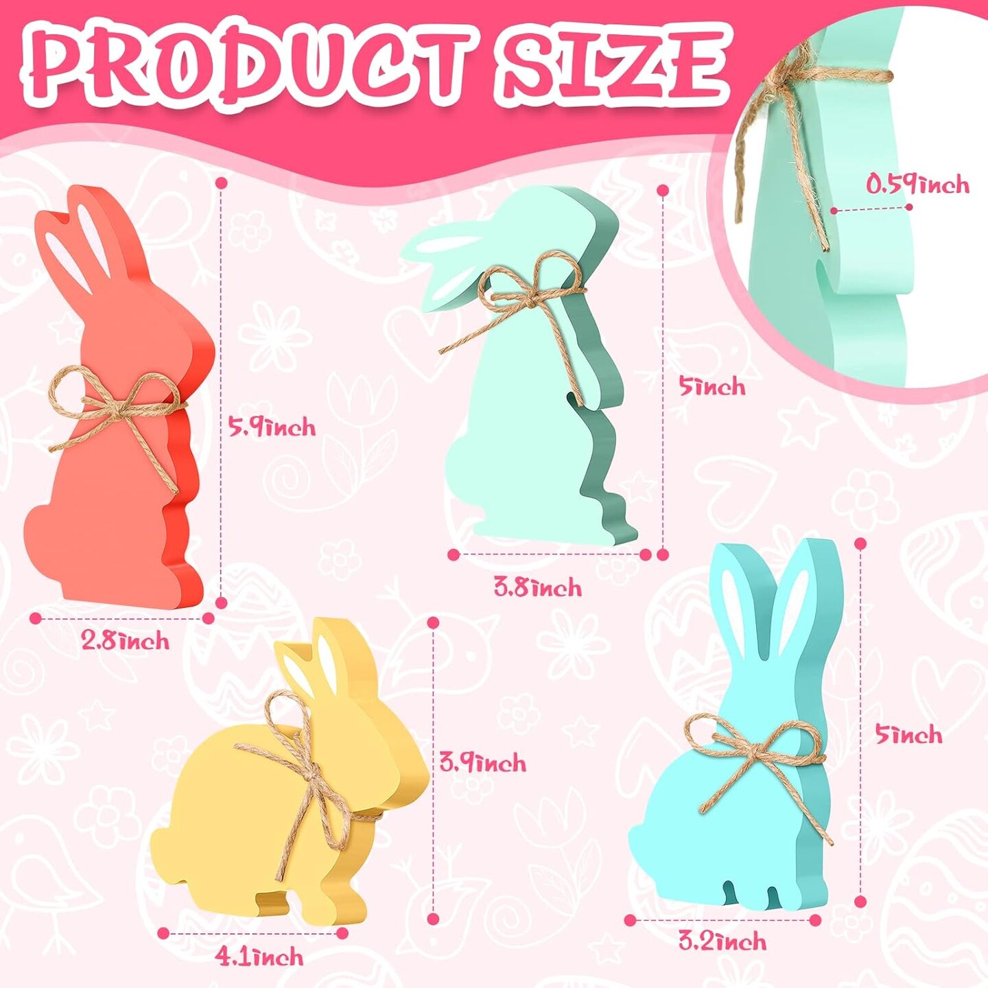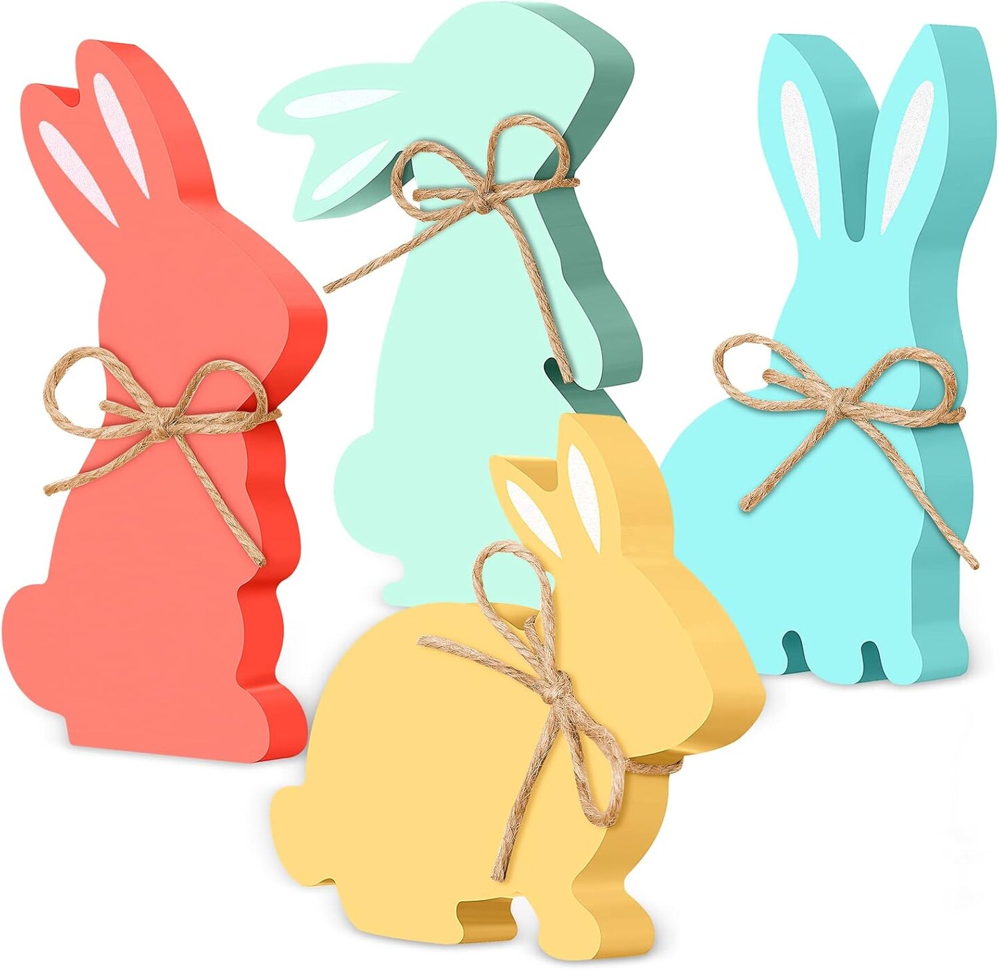 4 Pcs Easter Bunny Table Wooden Signs Bunny Shaped Farmhouse Decor Spring Rabbit Wood Tabletop Decorations Easter Rabbit Dining Room Table Decor Sign with Rope(Cute)